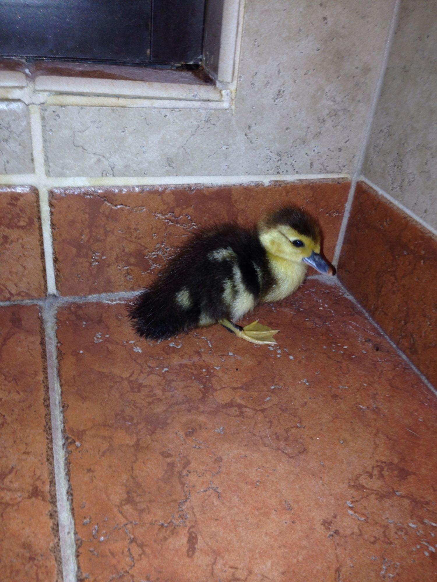 I have a duckling that was given to me last night. He found it in a drainage ditch. Perfectly, just a couple days old. At first I thought it was a mallard, but yellow feet, long wide tail, yellow bill tip and too much yellow on face means not full mallard. I'm thinking Muscovy. Anyone have any ideas?