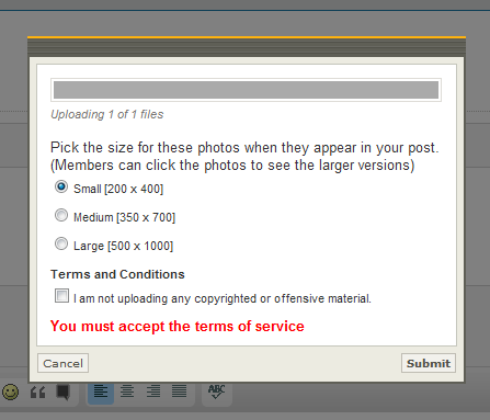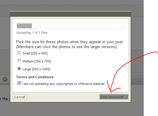 On the old way I could see when the picture was done uploading. It took 1/2 hour to upload a relatively small photo. I suppose I might try waiting 1/2 hour before I hit the submit button and see what happens. If my computer doesnt disconnect from the net. That happens sometimes.