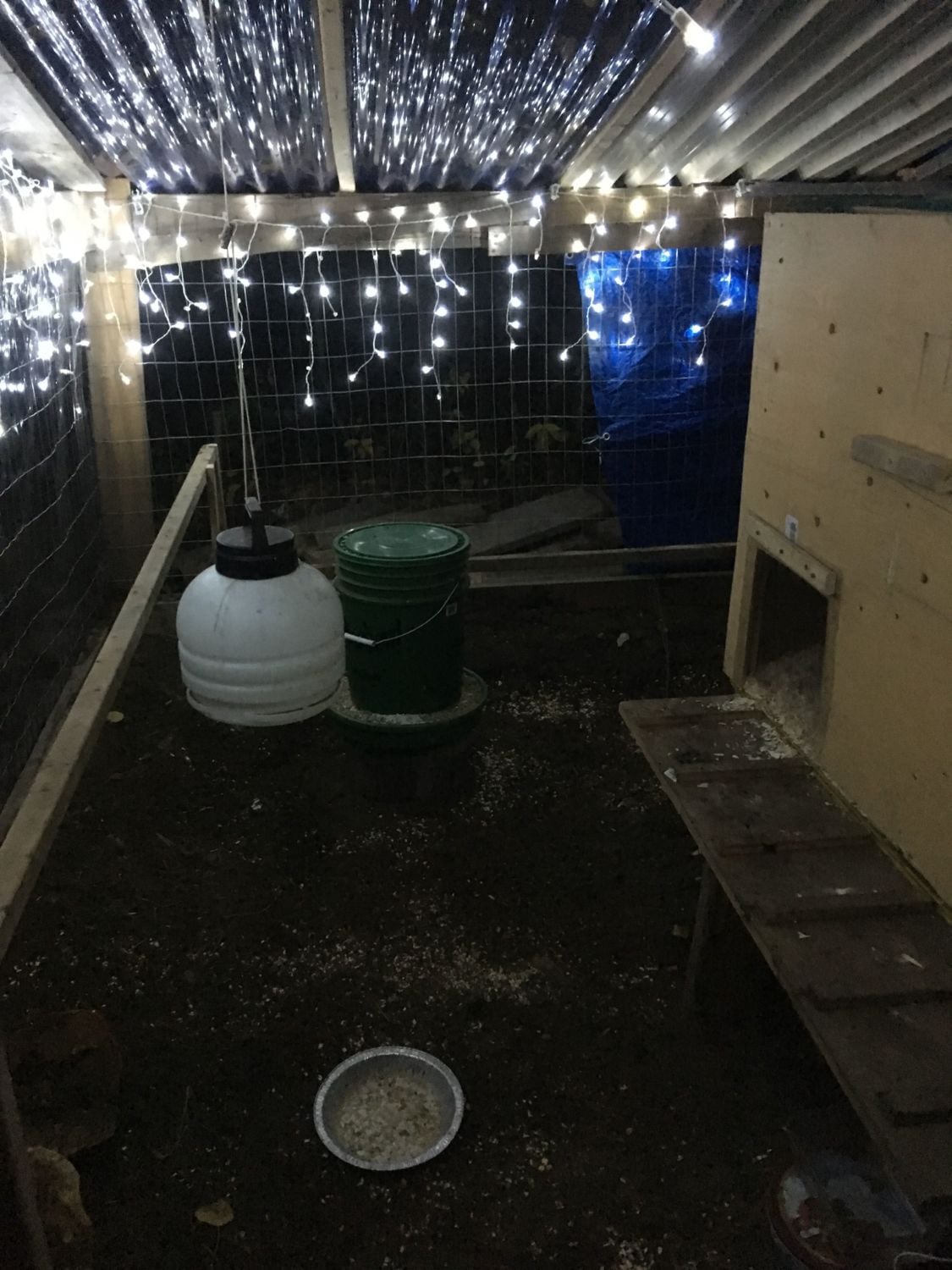 Below are pictures of my chicken coop: One at night with the lights on (they're LED and don't produce heat), and the second is during the day. Don't mind the Santa Claus tin, it's their water heater!