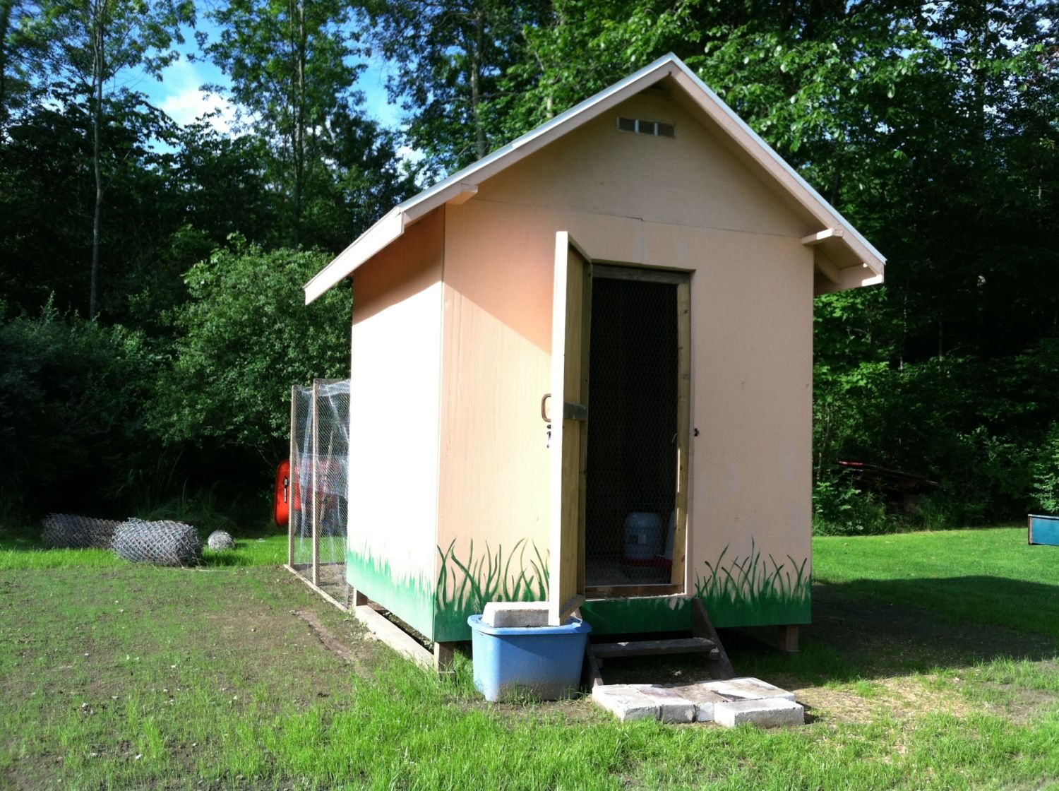 against the one wall is a hanging feeder, a waterer on blocks, and the roost.
