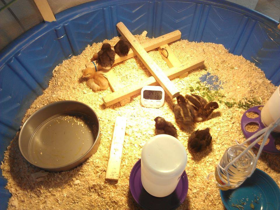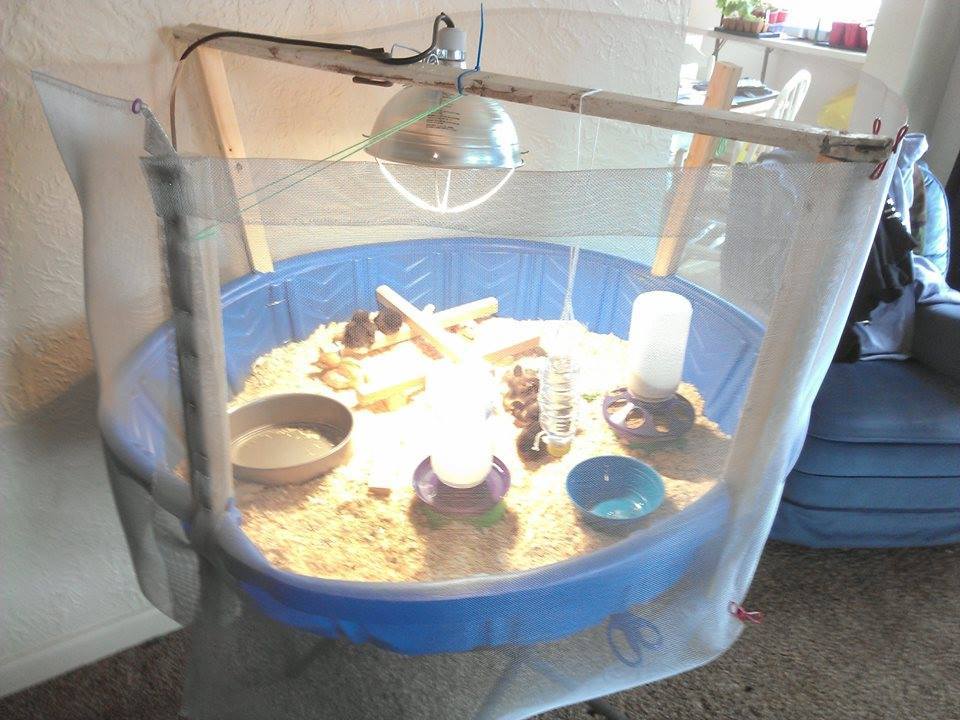 My brooder is a kiddy swimming pool set up to do so. It has a wood shaving floor (I just found out that pine is the only acceptable bedding for chickens but chicken people sold me this bedding so I assume it is safe for them-) Perches to get up an on things and of coarse, clean food and water.