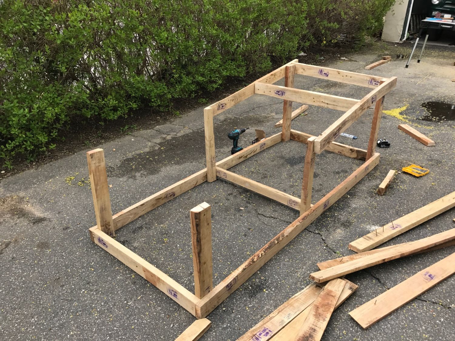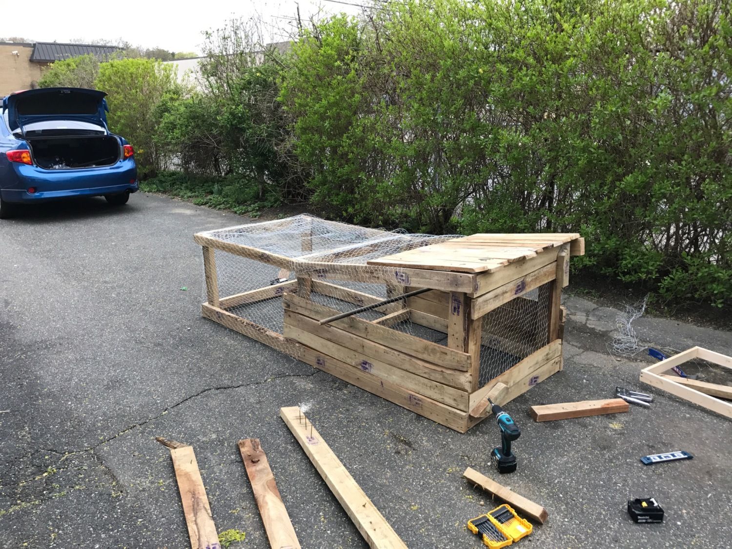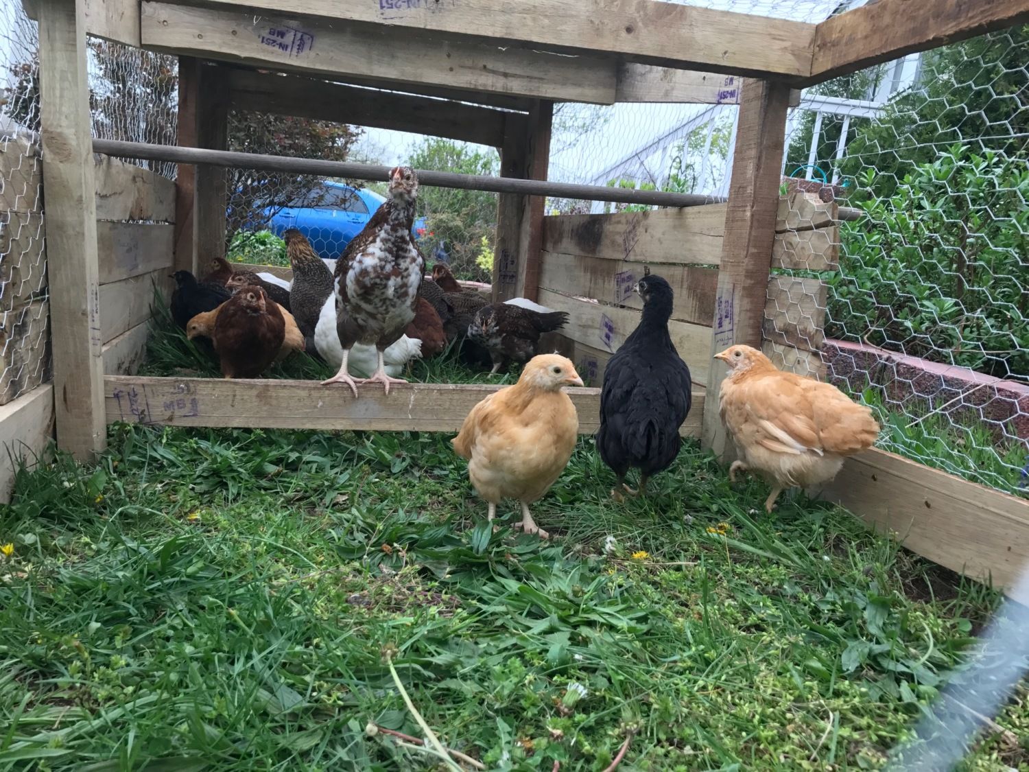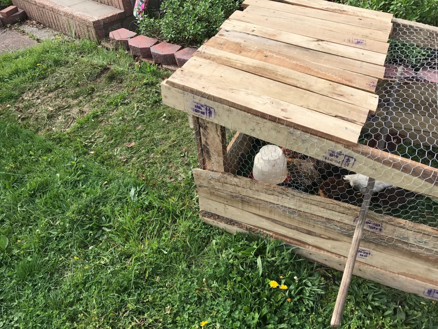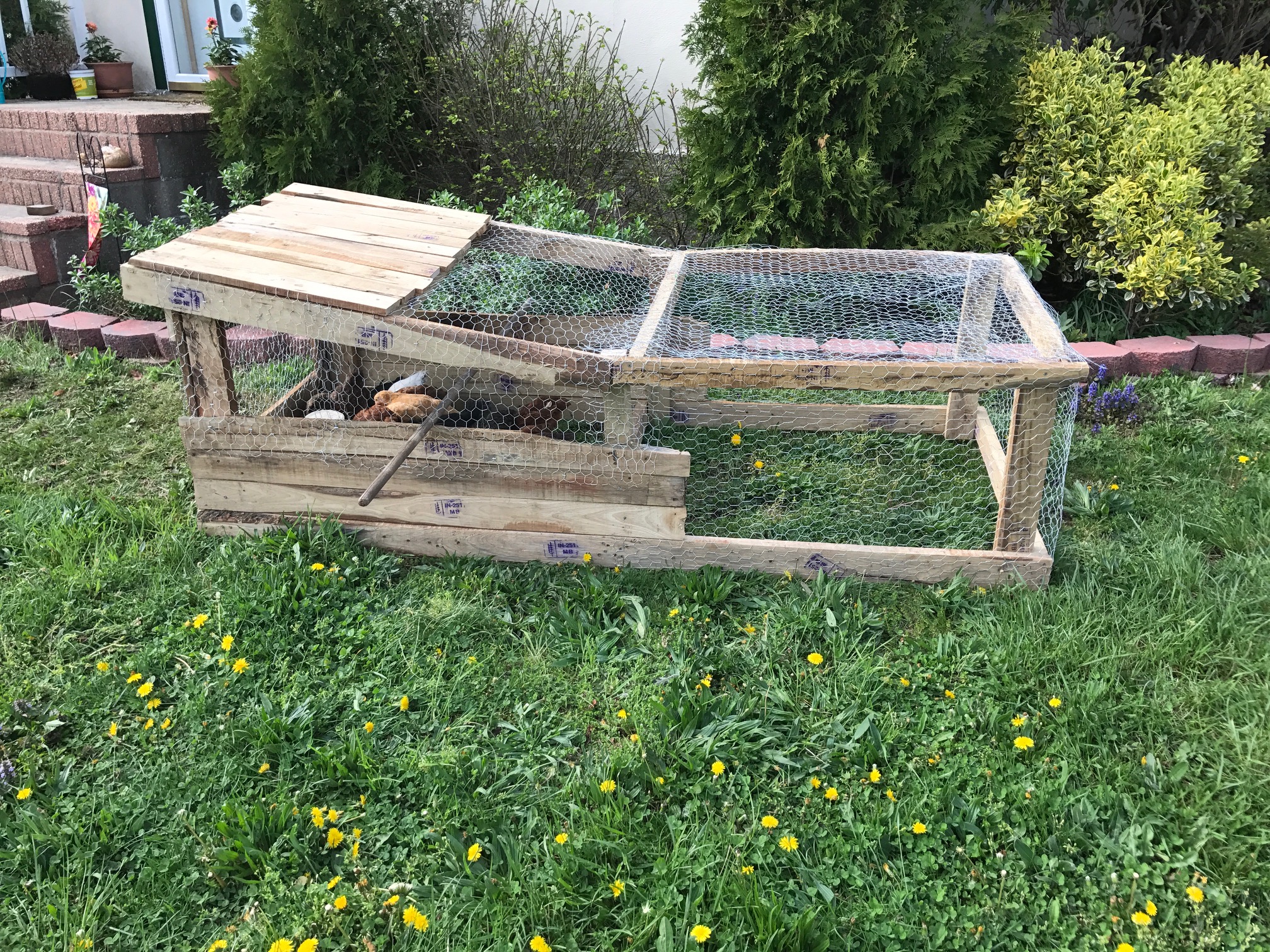 I attempted to make a chicken tractor that was inexpensive and could be taken apart. After ripping my hair out for a couple of days I decided that was not feasible. HOWEVER, I noticed my neighbor throwing out mounds of old hardwood, looks like maybe a poplar. I took a bunch and made a chicken tractor in a day, about 9 hours to be exact, and cost a total of $24.00 for screws and chicken wire. The little chicks love it and once they grow up and can mix with the other hens I will be putting 3 or 4 large hens in here to go around the front and side yard. Let me know what you think.Top photo is my first attempt. I would up returning everything but the used wood. ($13 wasted, not bad)