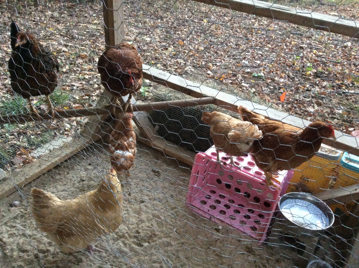 Here are the new girls. That pink crate had hay in it for a nesting box but their first order of business was to remove it and use it for a roost.