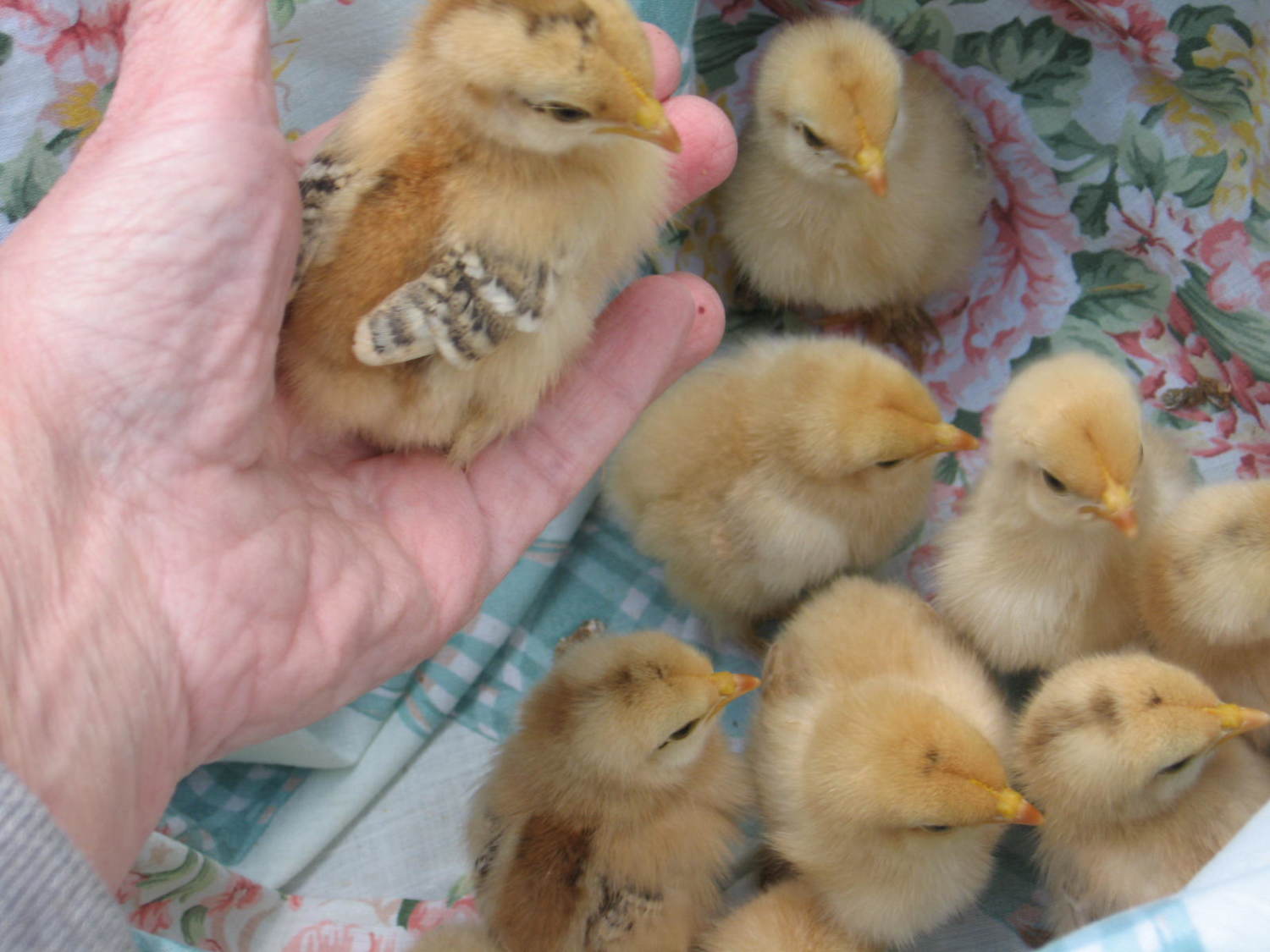 I only have one rooster a Mille Fleur Bantam and 2 Buff, 1 Splash, 1 Black, 1 Mille Fleur hen. Question is this...if I keep breeding back my rooster to the chicks and then their chicks chicks...you know...is it inbreeding and dangerous? I know about dogs and cats in breeding but not chickens. The chick in my hand better be a hen...it is the first to hatch and started in the incubator, but I kept loosing eggs half-way through and put this little one under one of my hens who finally went broody. You can see by the wings that it is different...