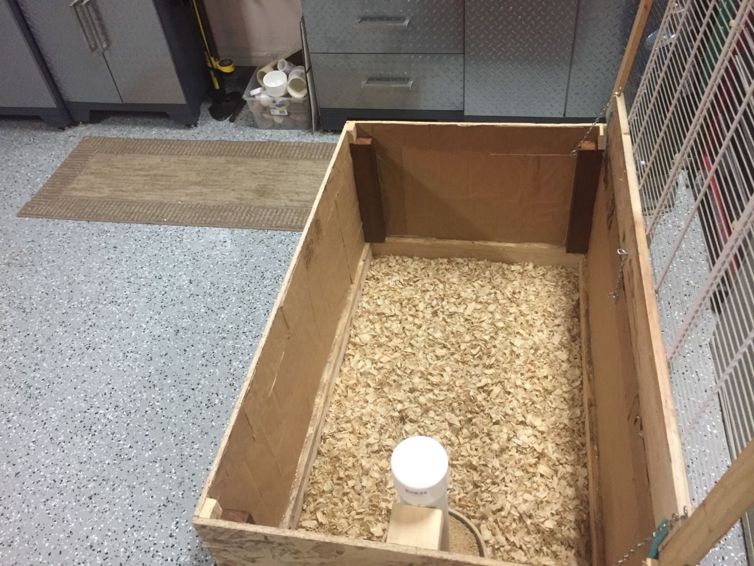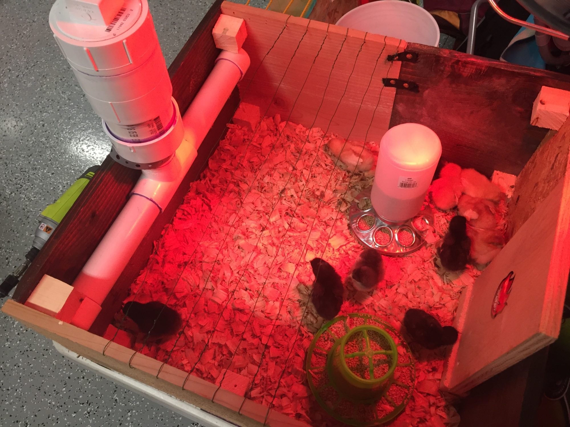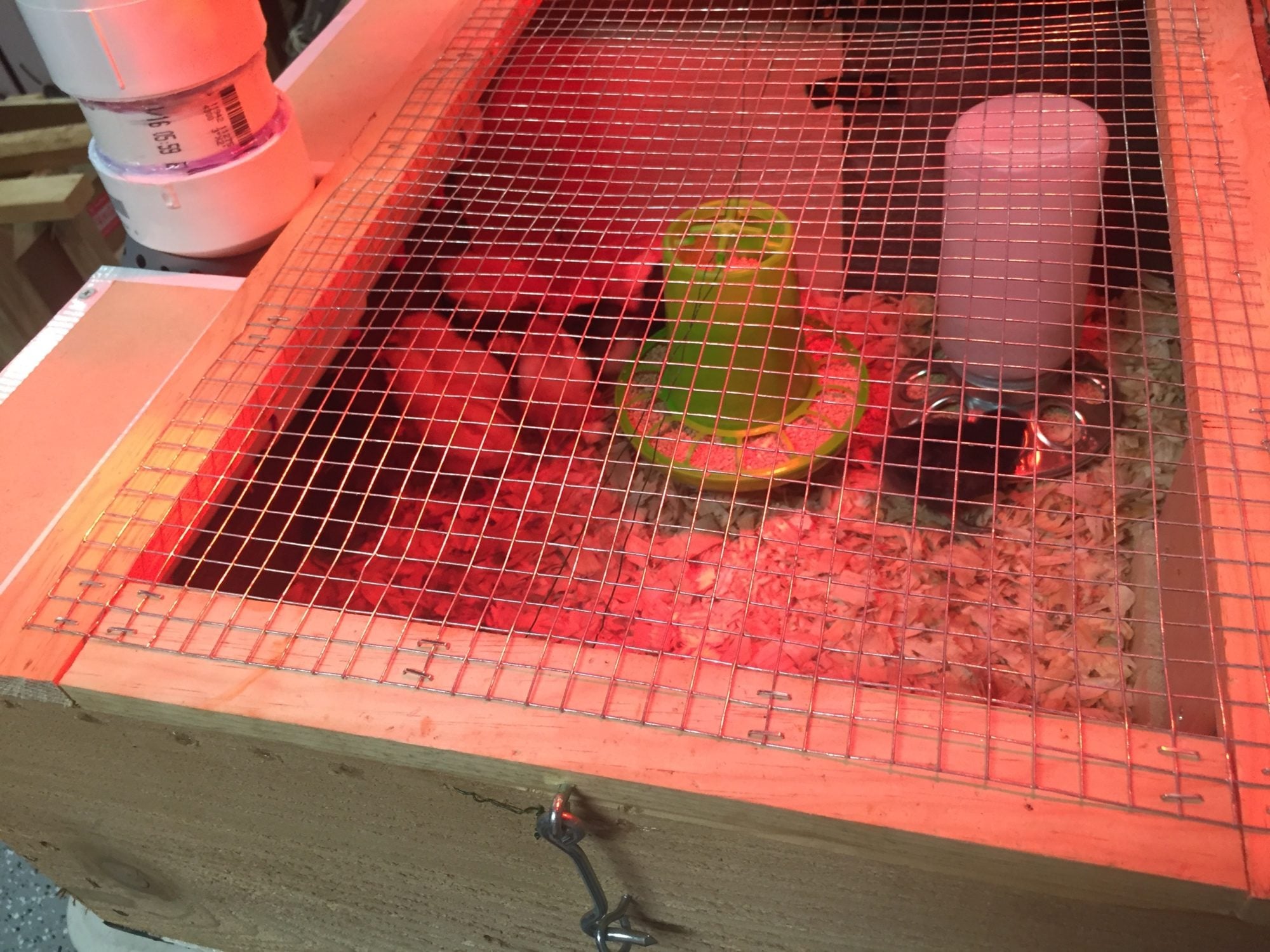 First iteration before I made a hinged top with hardware cloth etc-- the chicks are happy and warm!