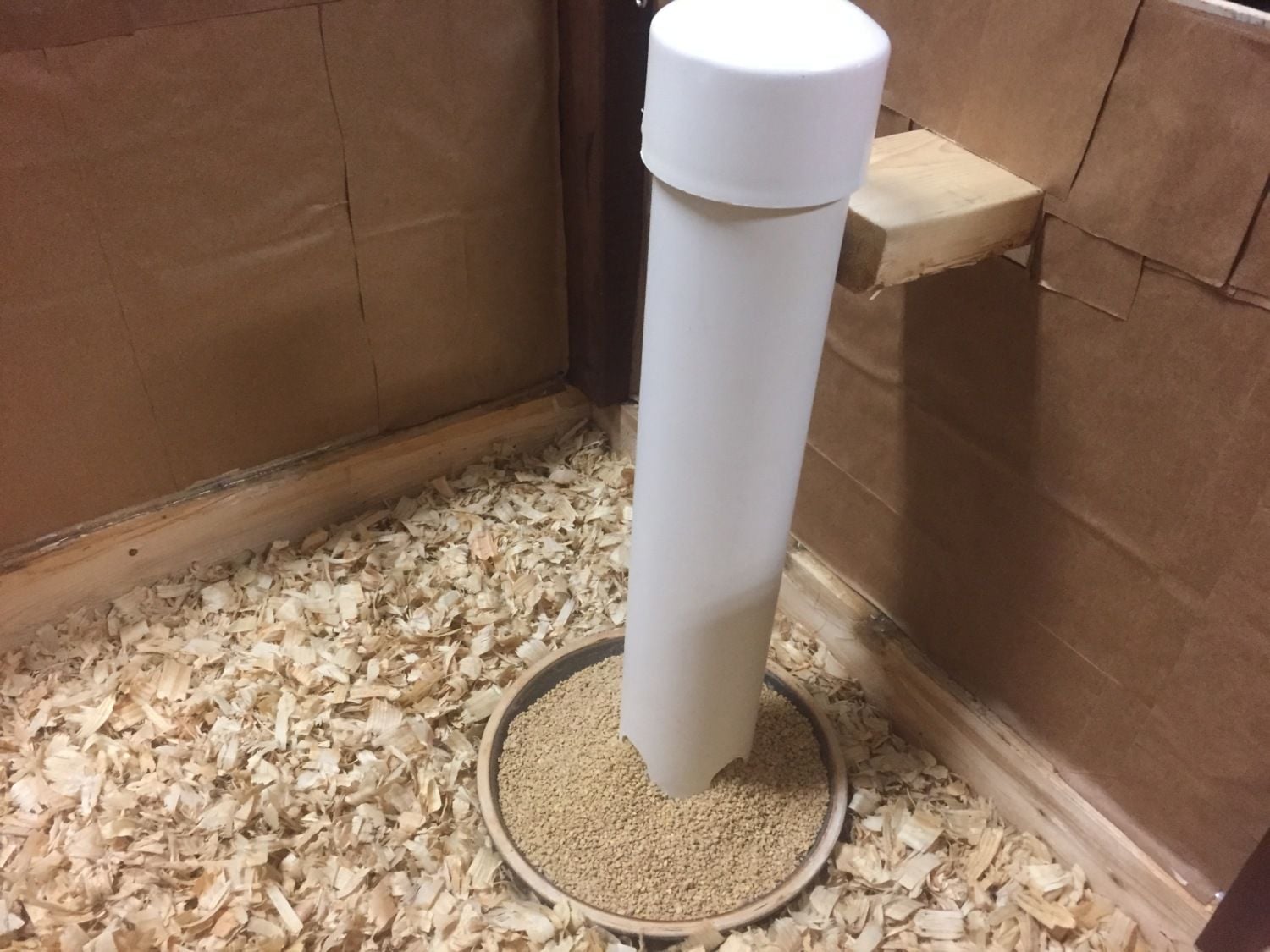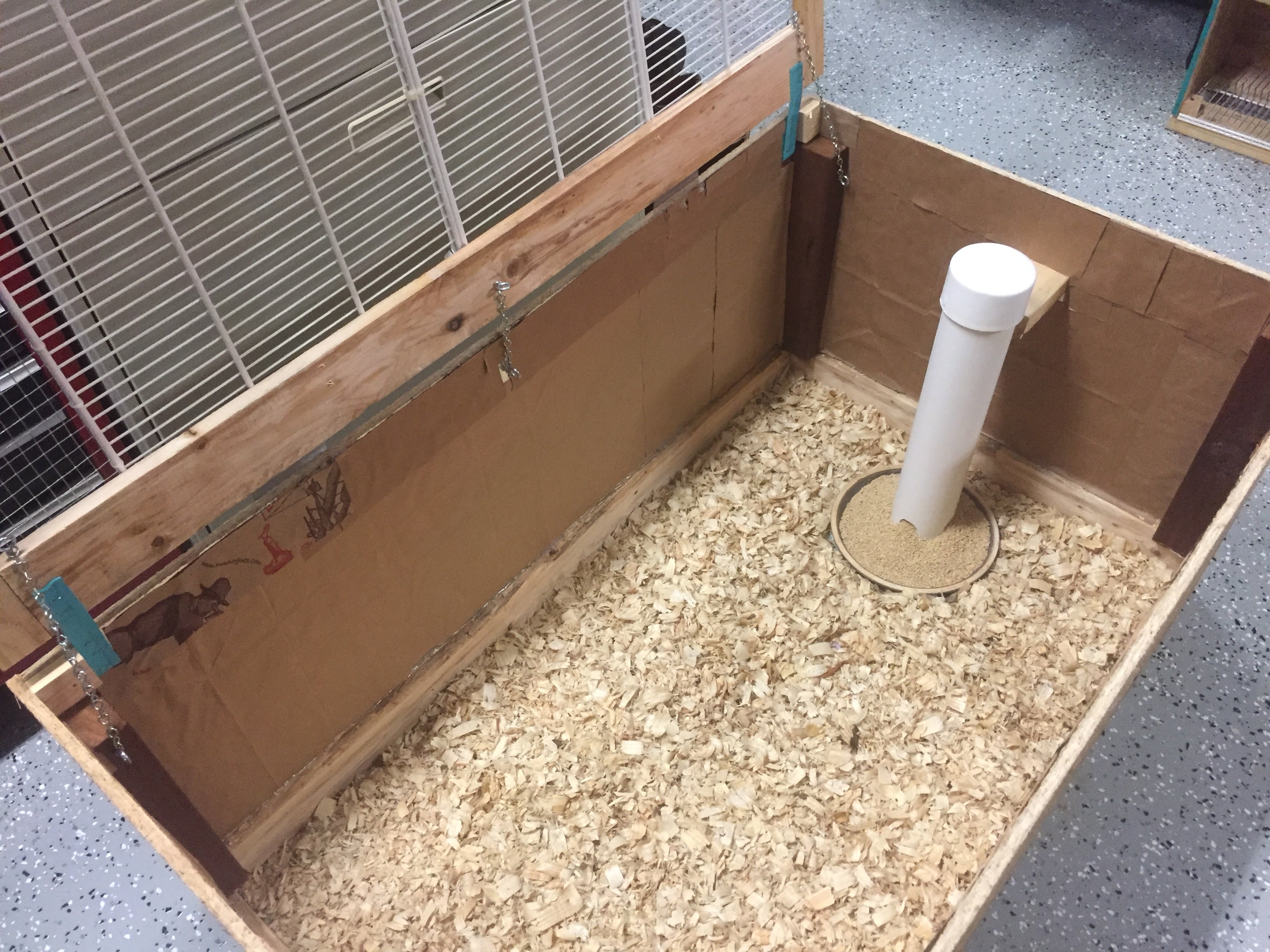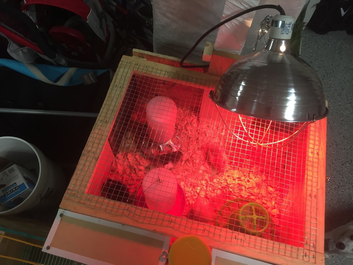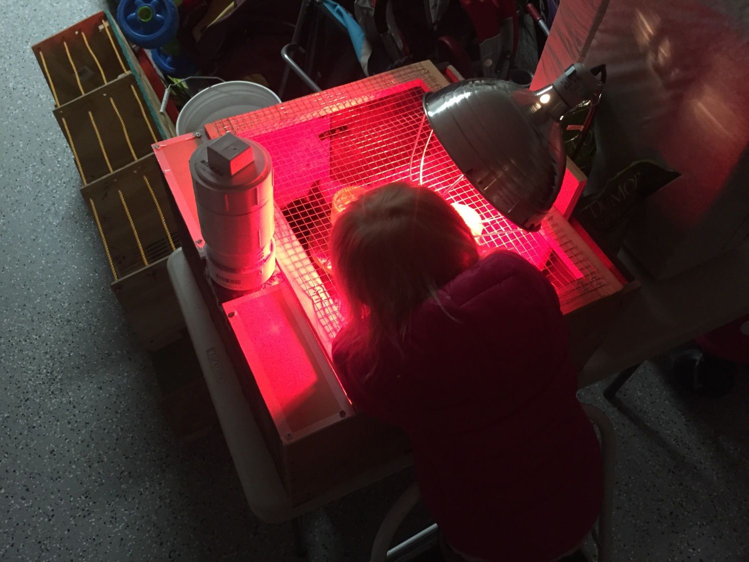 First iteration before I made a hinged top with hardware cloth etc-- the chicks are happy and warm!