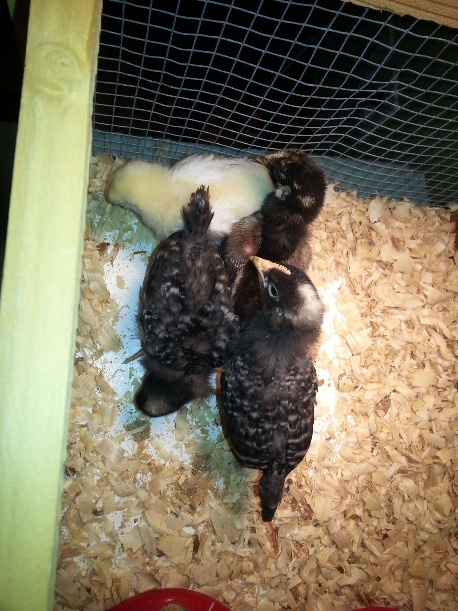 Ok I'm brand new to this whole chicken thing. I picked up 4 chicks today. 1 of each of the following light brahma, cochin, blue laced Wyandotte, barred rock. I believe they are around 3-4 weeks old, for some reason my memory is failing me about how old they said they were. I also got a starter package they sold, 50lb bag of feed, pine shavings, a cage, waterer, feeder, reflector and a 250w infrared bulb. I have a few questions.