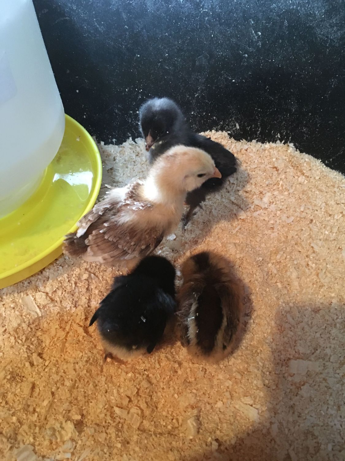 these are 4 out of our 6 chickies. The two older girls are an Russian Orloff (Olga) and a barred rock (Henrietta). The two smaller ones are an Australop (OZ) and an americauna (Gracie), This was over a week ago and they have grown amazingly since this pic.