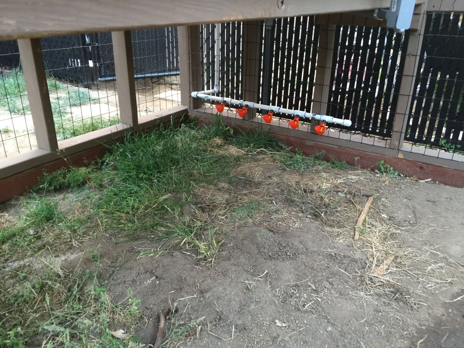 I have cup waterers located under the coop and they are fed from a bucket that has a float switch in it to keep it full. I will be adding a treadle feeder that will have an added PVC fill tube so we can be away for a few days without worry.