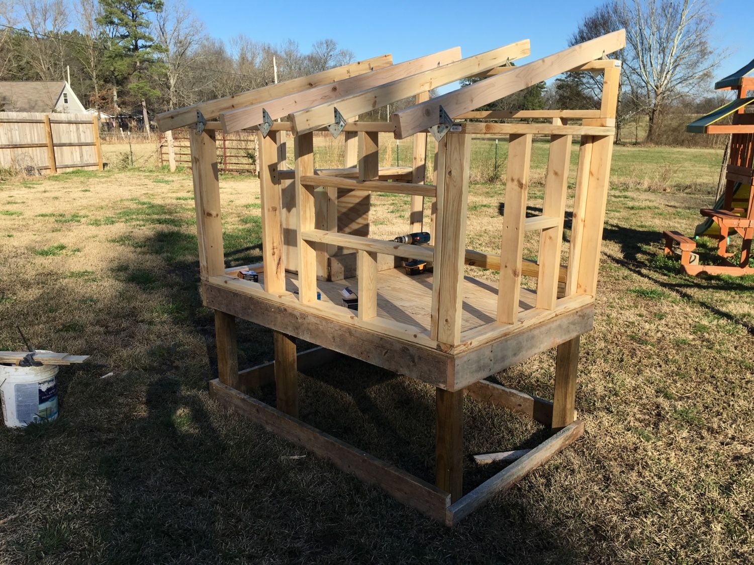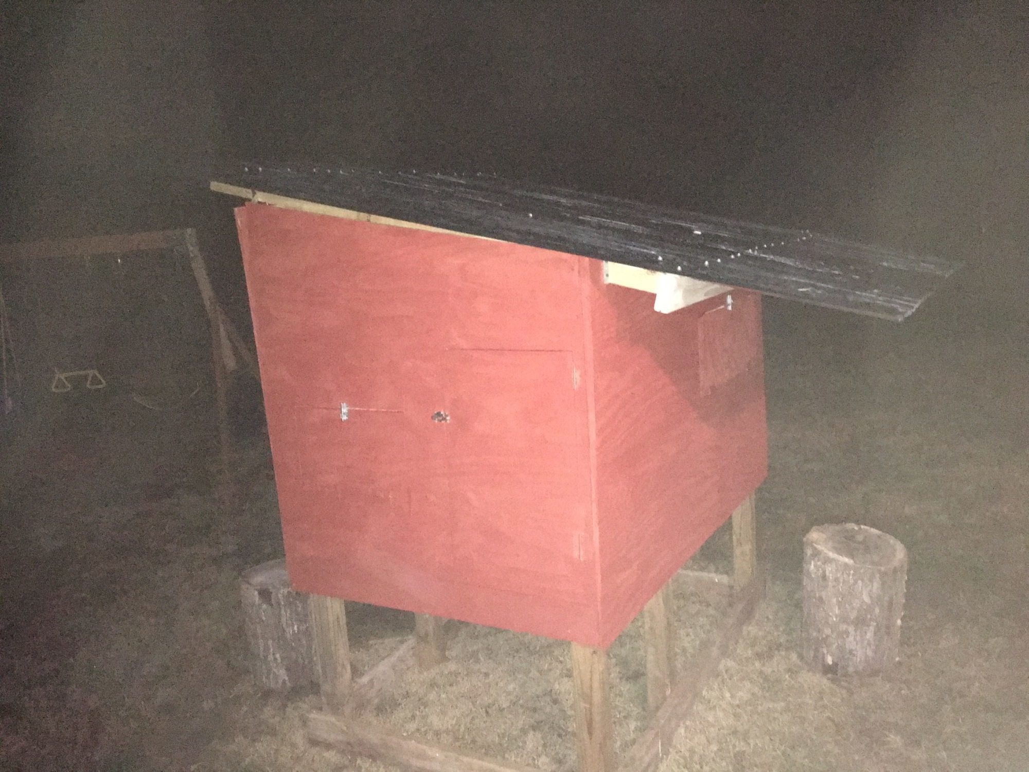 A lot of my work was done after dark, after the kids were down...and the weather has been exceptional, 30-40s and rain rain rain...I used 4x4 posts for the legs and 2x6's on the runners. The side of the front door is a 2x4. I was afraid the 2x6 would be too big for the chicks to climb over to get under the shade.