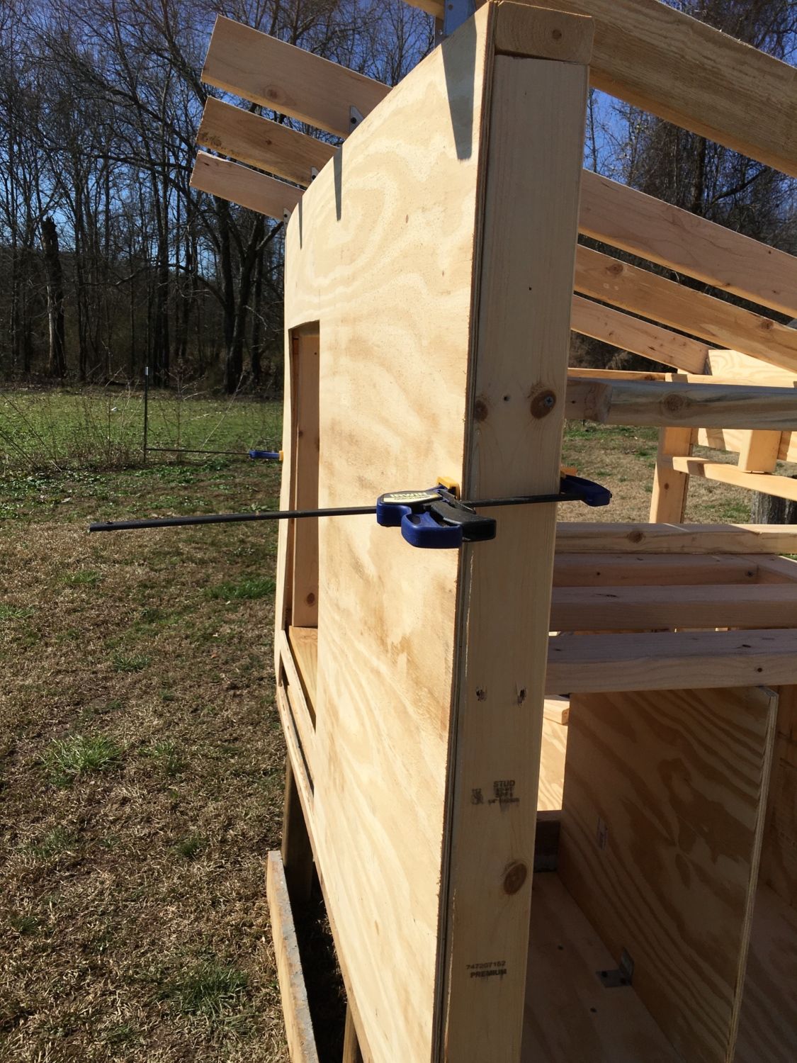 Clamps are a man (or woman's) best friend when working alone. Here you can see the 8" overhang on the roof line. The rafters are about 5'6" or so long. I wanted just enough to keep the rain off the coop and windows/doors.