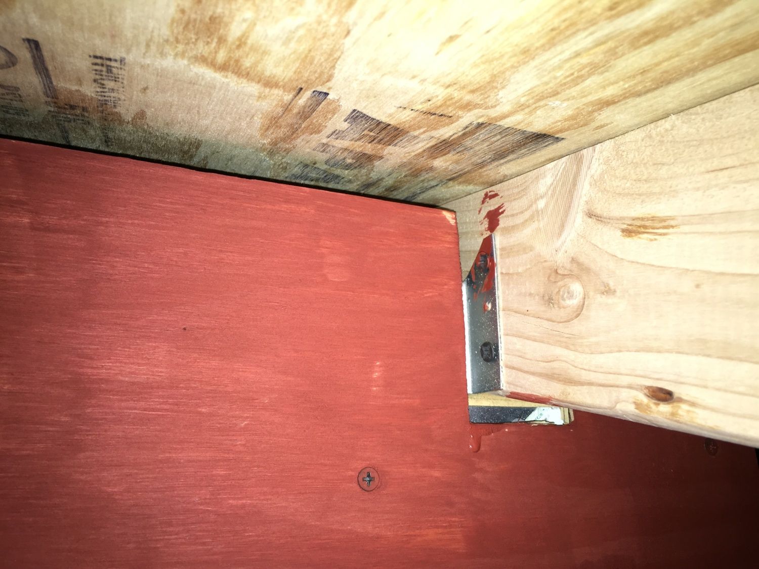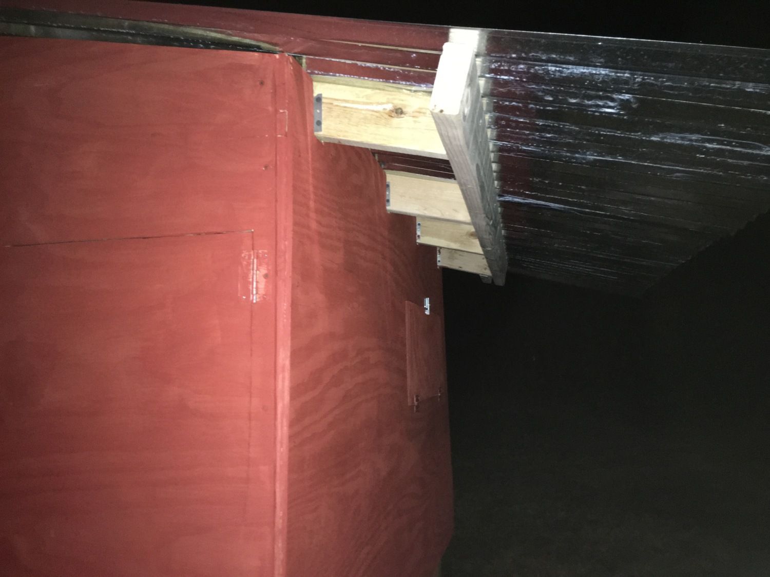 I decided to install the 4 roof panels before cutting to avoid any miscalculations. The coop was built on a 4x6 but it's a little off here and there. I ran a support joist to have something to attach the roof to. Same thing done on the other side.