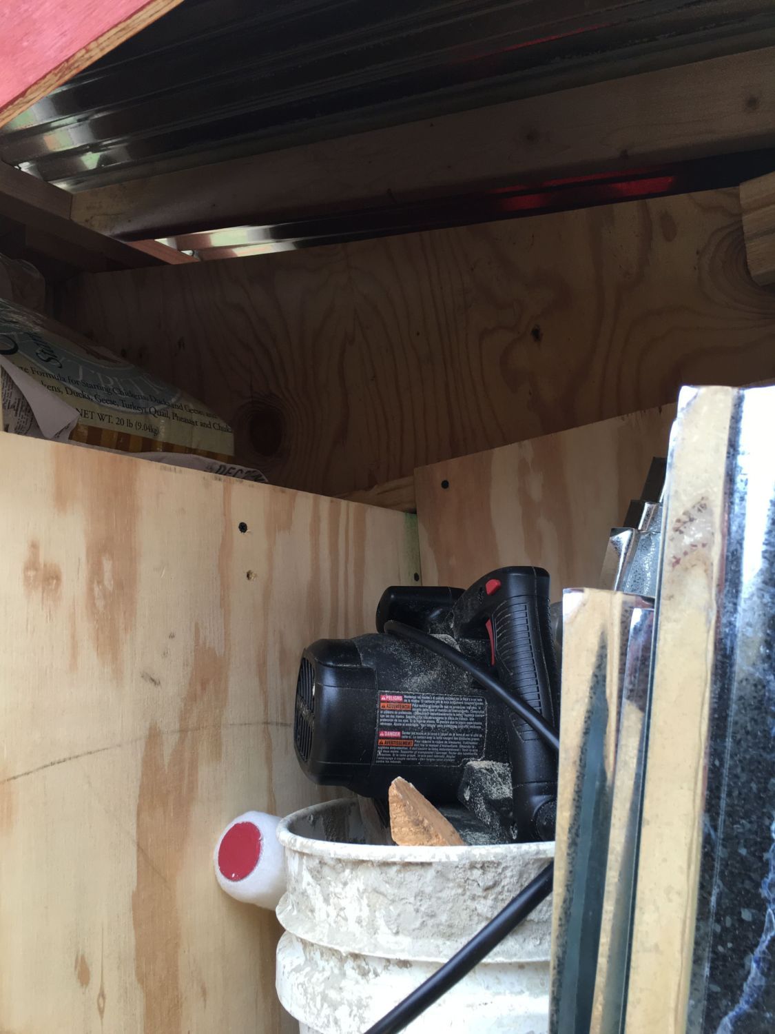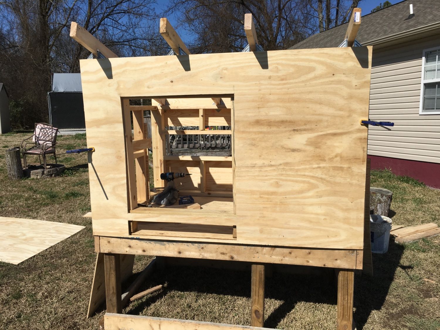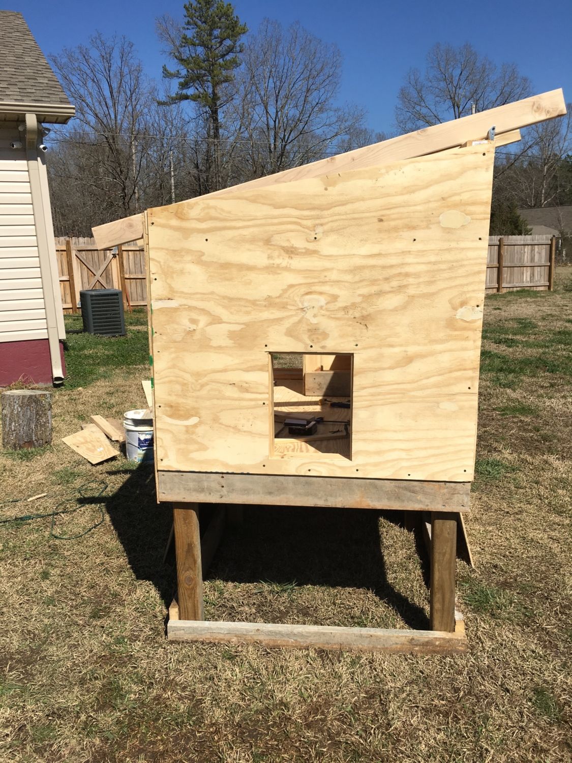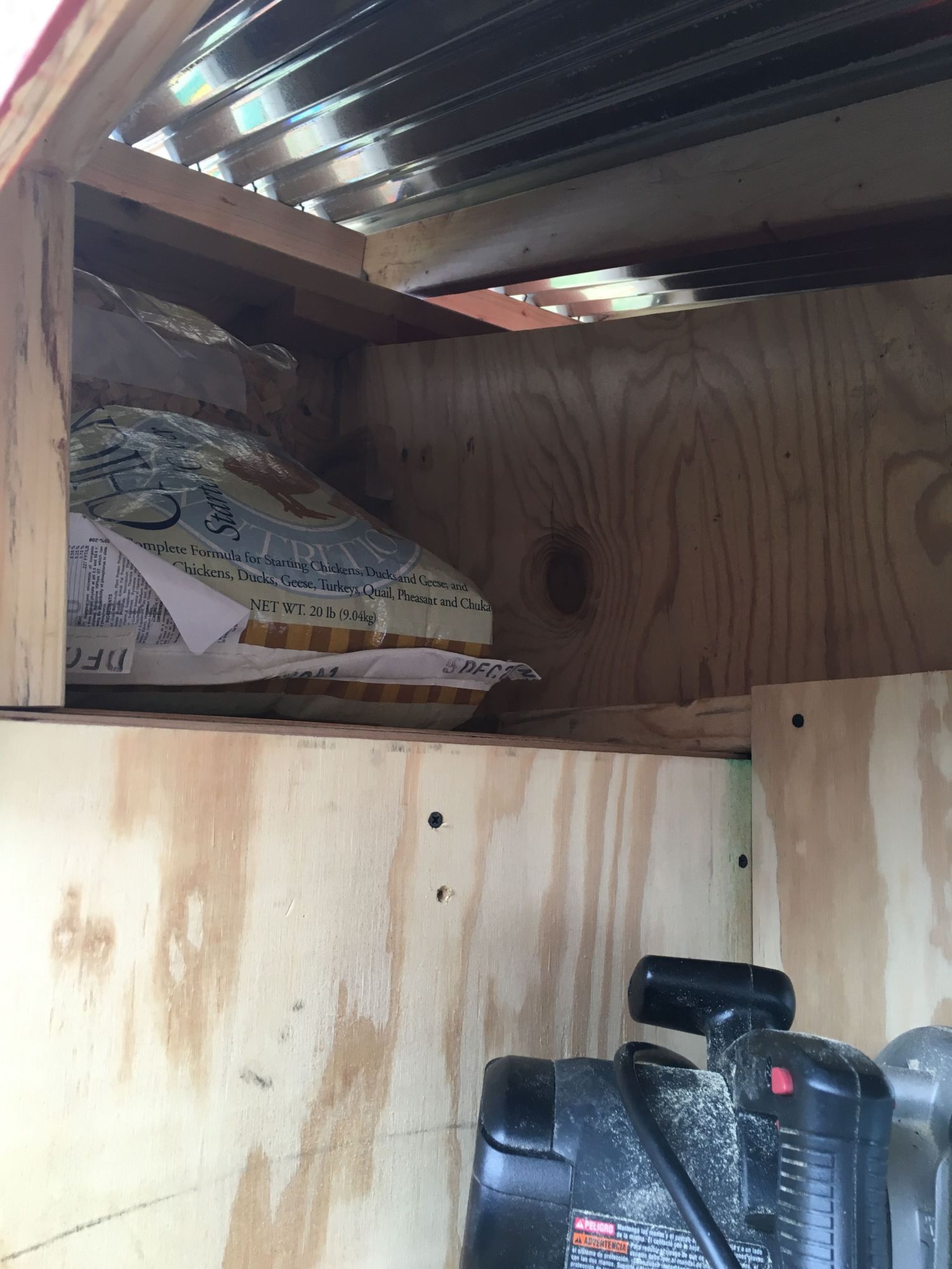 Used left over plywood to make a chicken door track. Screwed in some eye bolts and left over twine...google it, there are several ways to do this.