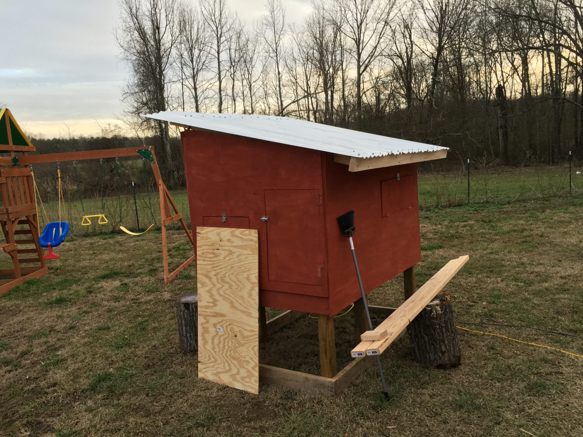 Semi finished. 1 coat of paint on, still 1 more to go. We are going to trim it out with white around the coop and doors / windows to give it a nice finished look. The weather has not been cooperating thus far.