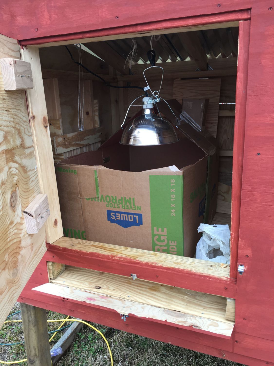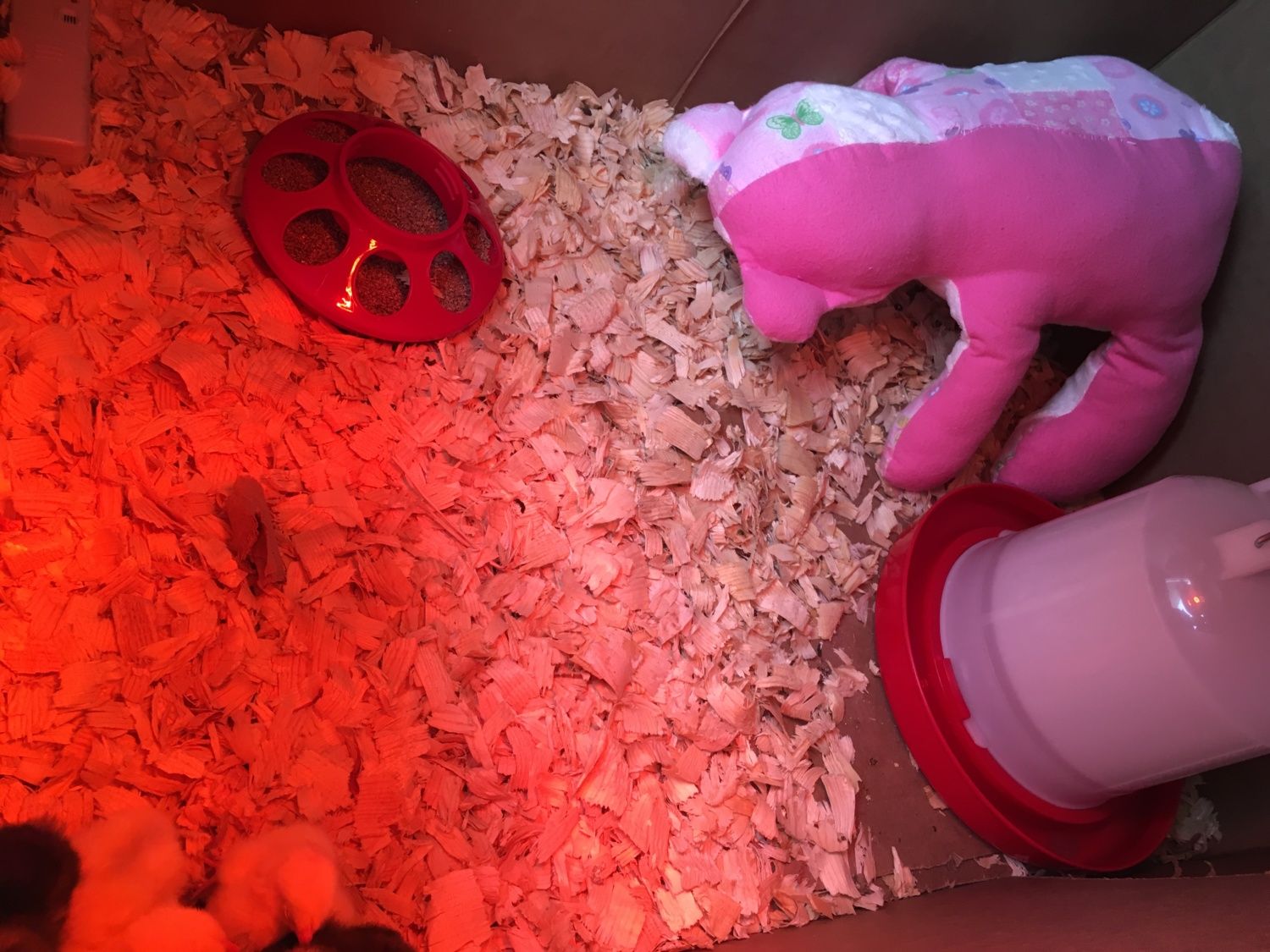 Here you can see inside. I had too many pine chips inside and took a bunch out. They were buried in them. Water is furtherest from the heat. I also added an old teddy bear. 1st time with chickens but I read it helps them feel like they have a brooding hen. This made sense to me and I've caught them all hanging out under there several times. It's usually their go to hiding spot when I come to wipe some butts. Plus it holds the warmth and gives them something to climb on.