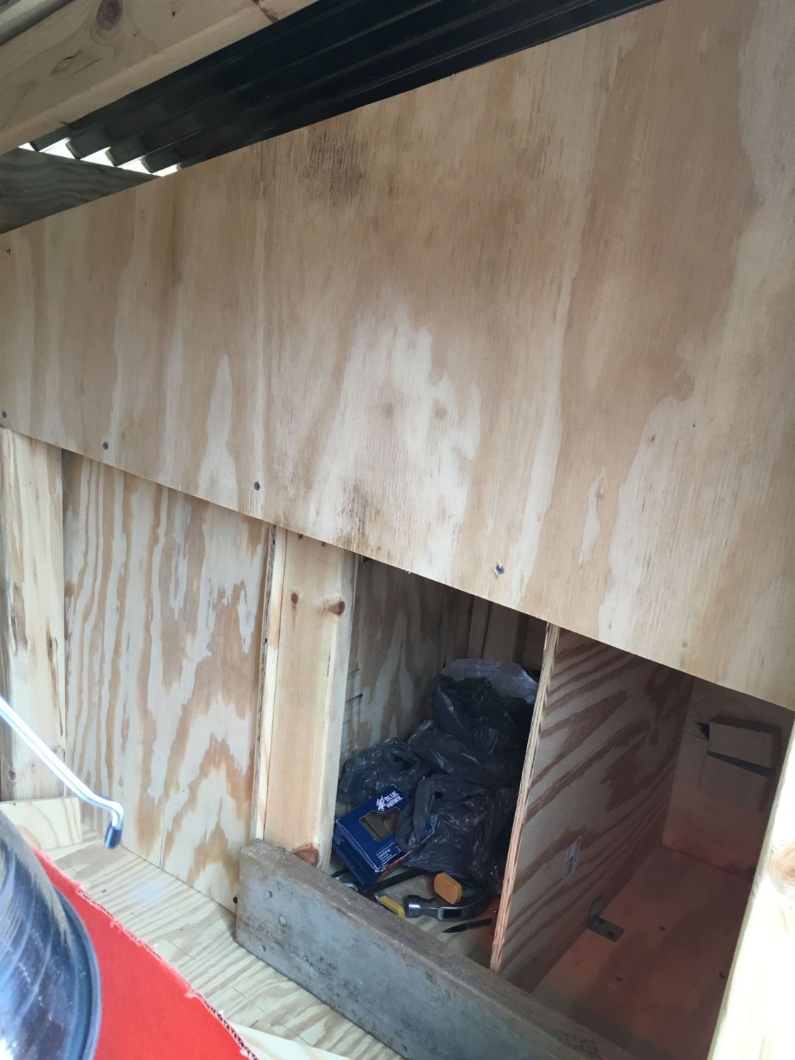 (right pic) Nesting boxes on the left. Water tank locker on the right. You can't see it here, but I installed a roof across the top of the nesting boxes. So there is a large storage slot there. (detailed pic later)