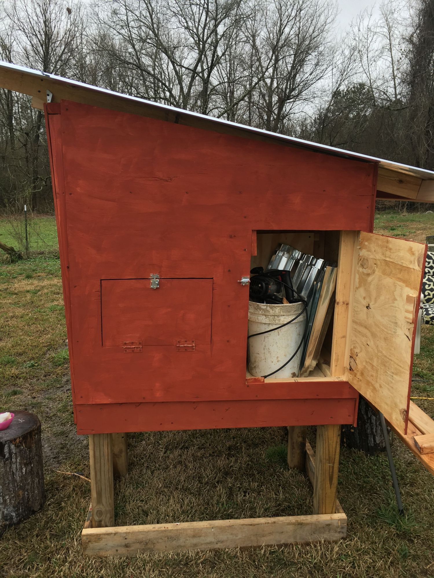 Nesting box and water locker (aka tool shed right now). The water locker is designed for a 15 gal water barrel. I'm going to run it out the bottom to some poultry nipples on a line of pvc.