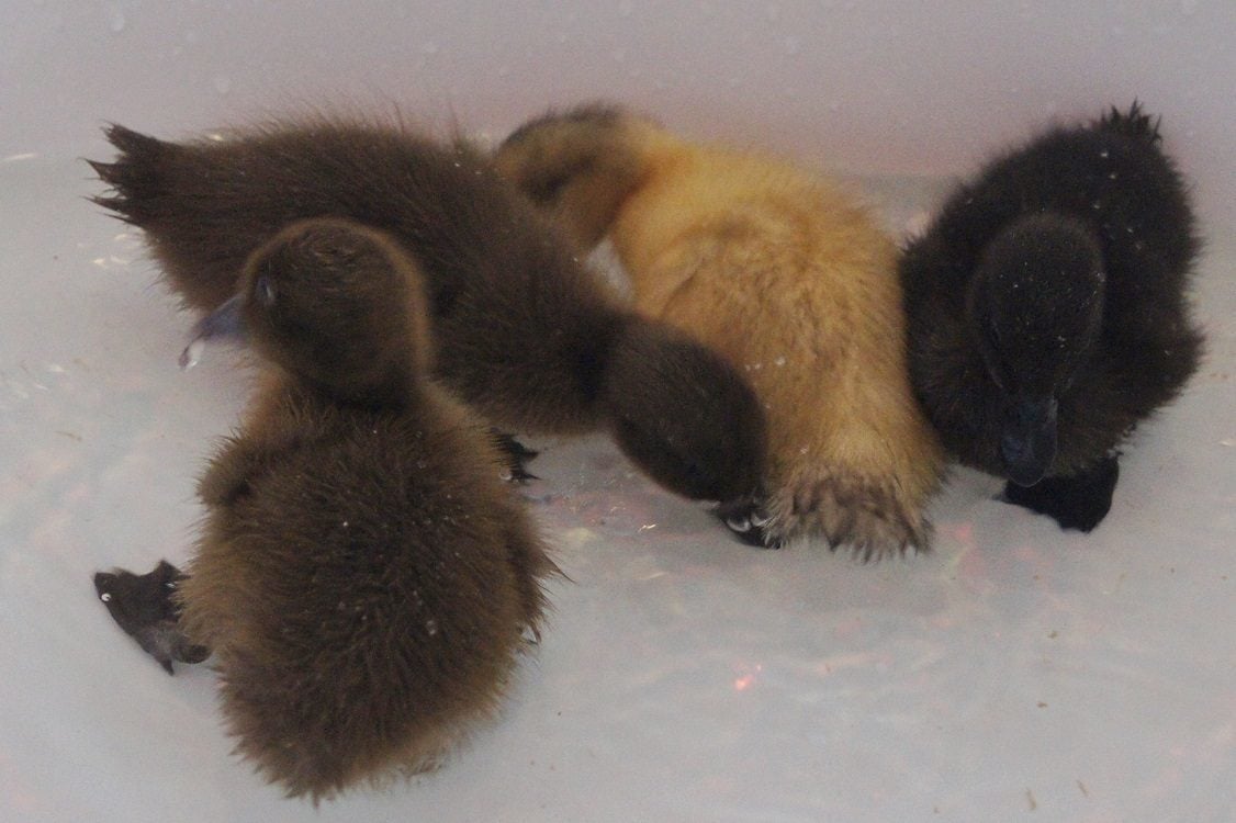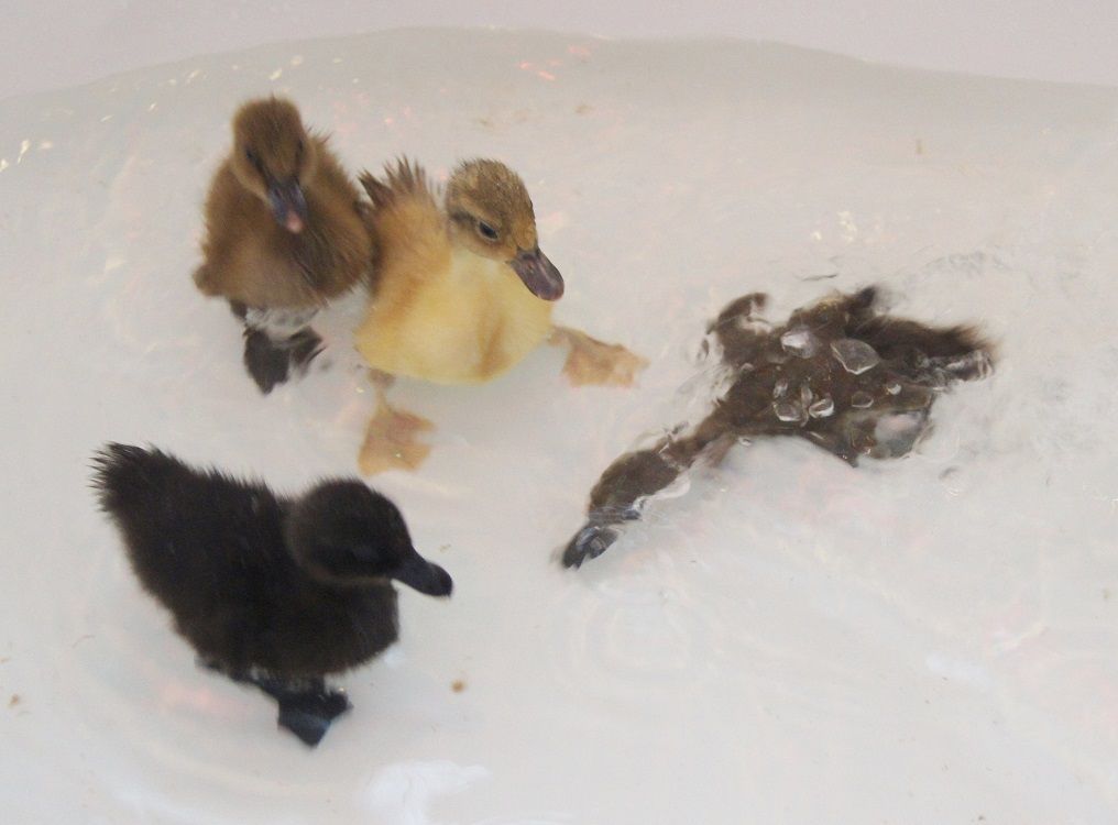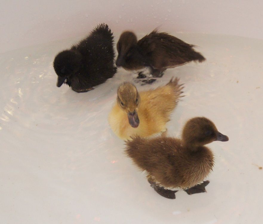 So I turned the little wall space heater up in our bathroom and the heat lamps, and the four ducklings had their first swim..