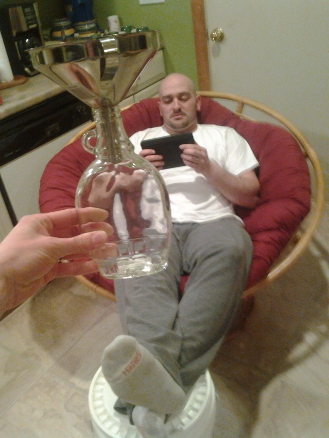 This is DH "monitoring" the sap lol. He dragged the papasan chair into the kitchen. Really he did a great job monitoring the sap for 6 hours.