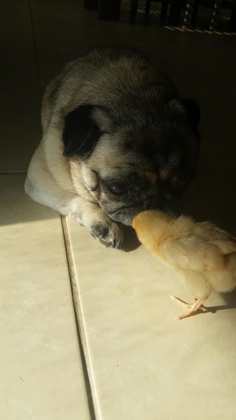 Thought I would share one of my pugs (Milan, 9 years old) with Uni (3 weeks old). Milan thinks she is the mother hen to these babies. She is quite loving with them and will lay outside their house and just watch them pick and scratch. She will press her nose up against the wire in hopes that one will approach her. I'm trying to raise them all together so when the babies are full size this winter the pugs can share the yard with them all in harmony! However, I don't ever expect harmony from my herding dog "Shelly".....the instinct is impossible to de-sensitize her to the chickens.