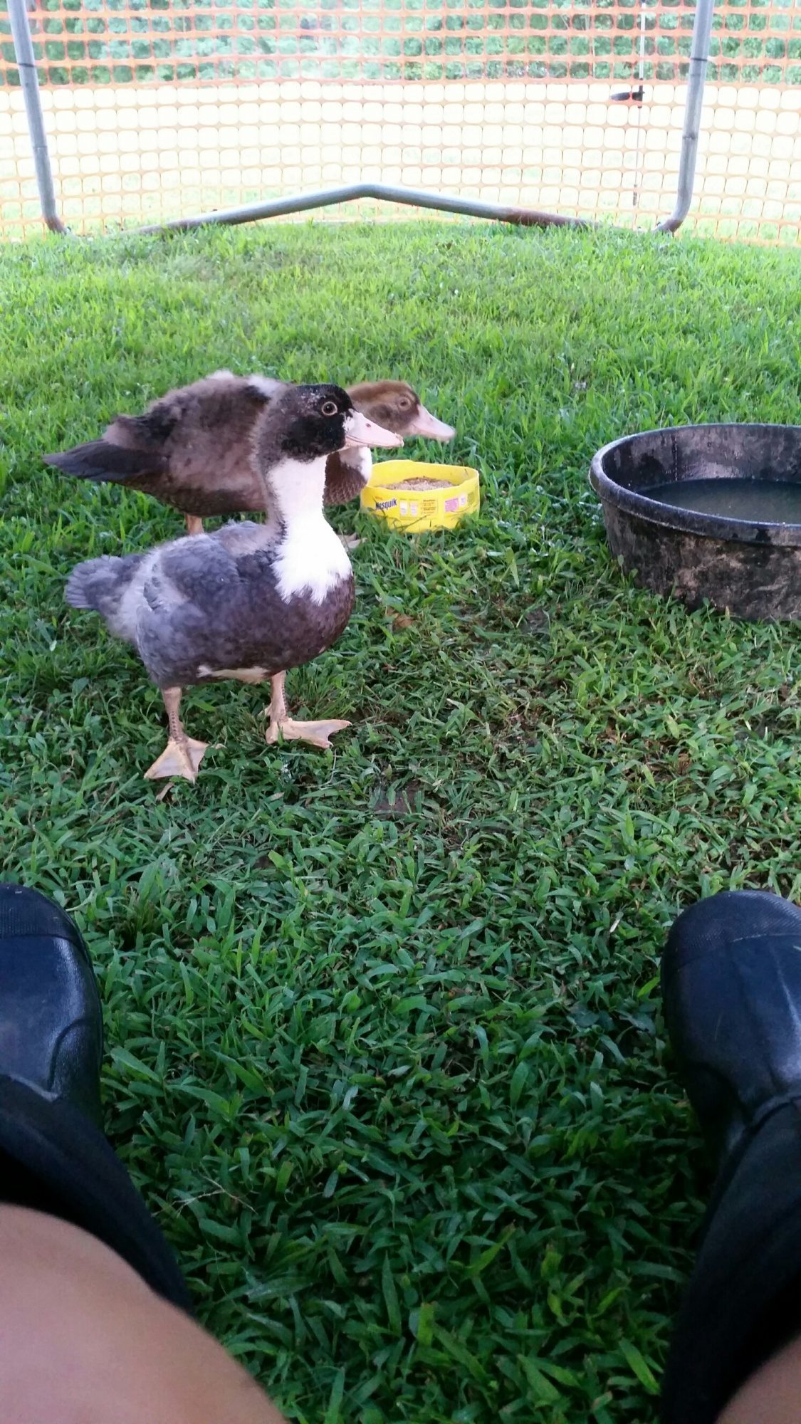These are my two ducks Trouble is the smaller and more black one and the bigger one is Nibbles I think he is the male. Could someone tell me what breed & gender & an estimated age.