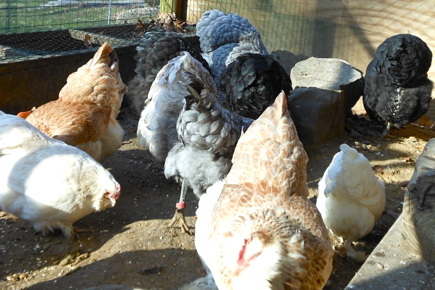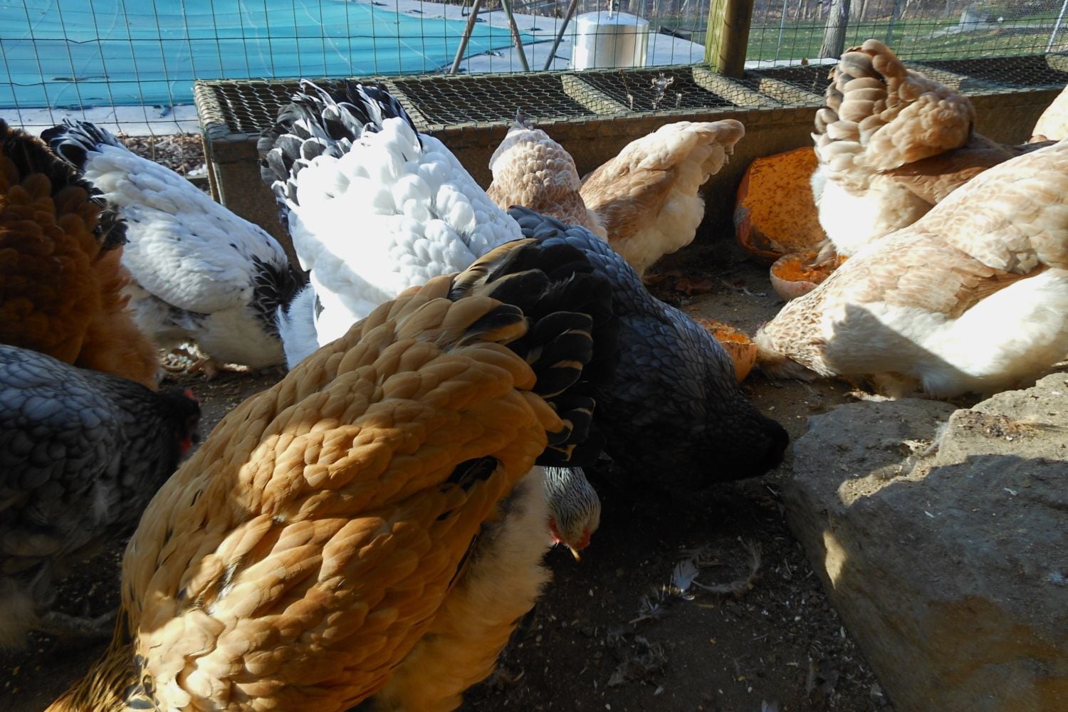 You had me realizing I didn't have a good picture of anyone's beard, so I went out to get some shots today. Stupidly, I threw out some scratch so they'd all come outside, but then all I got were butts in the air. I did get one of my pullets having a drink, though - how's that for a beard? Breeds visible are mostly LF - Brahmas, Faverolles, Giants, Orpingtons, Ameraucanas, and a New Hampshire. The rooster is a bantam Salmon Faverolles.