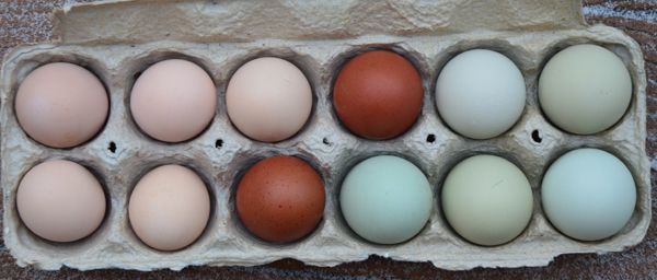 These are the eggs I've been getting - they are a little darker in person. Pheonix lays the green, the one marans lays about a 6+ on the color scale. The other hasn't started laying yet...but hopefully soon!