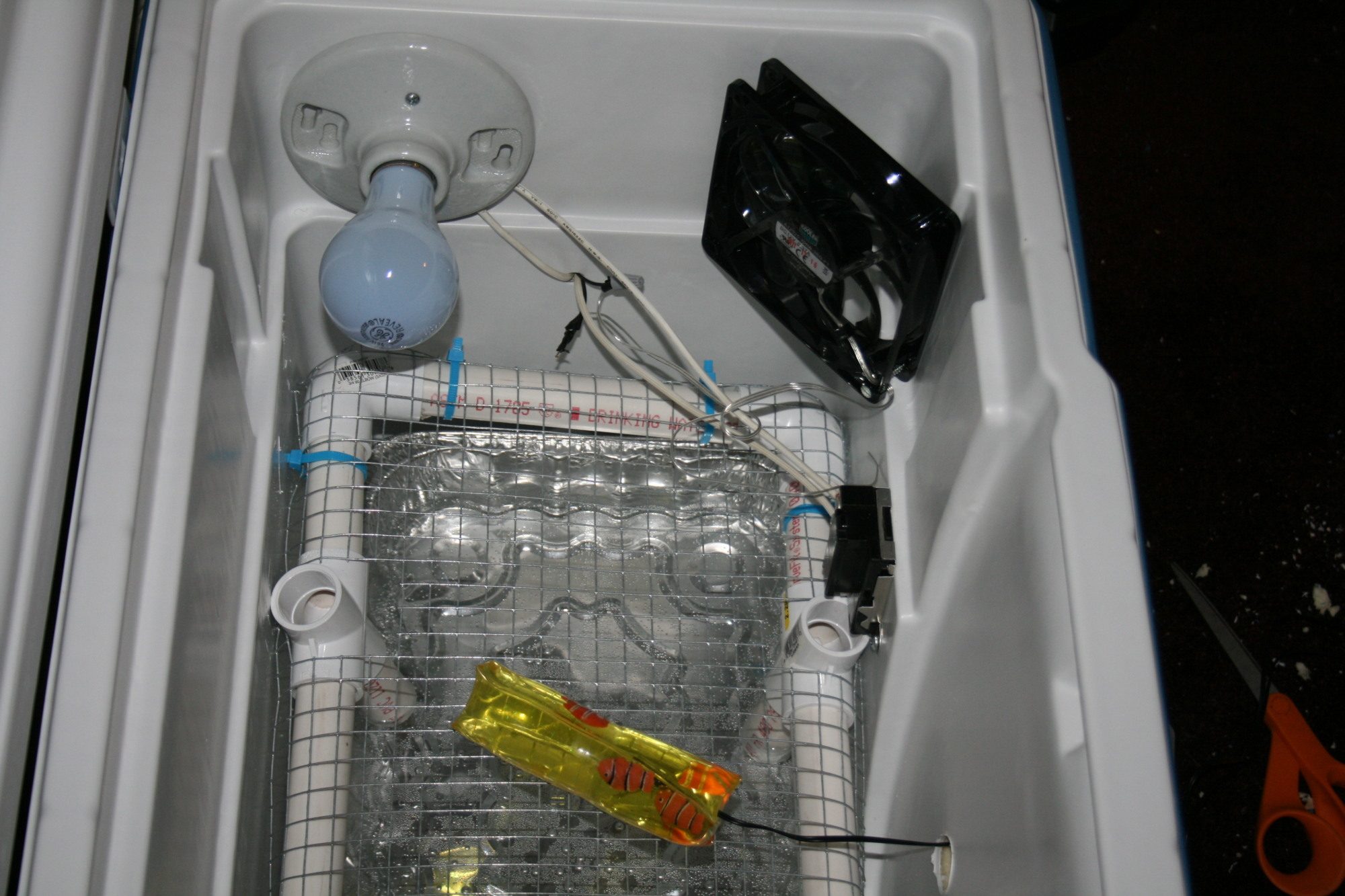My homemade incubator is a BIG cooler - not a styrofoam one though, it's plastic. It's got a thermostat wired in to a light bulb, and also a computer fan. I have a few holes for ventilation, and I keep some water bottles in the bottom to hold heat. My temperatures holds very steady - but I'm thinking it could use a second fan, I have a feeling there might be some cooler spots. It's pretty big for one fan to keep ventilated! But other than that I can't complain. I think it'll be good for lockdowns, a little bit of fluctuation in temperature will be okay for the last 3 days, I'm just thinking it might cause issues if it's going on during the full incubation.