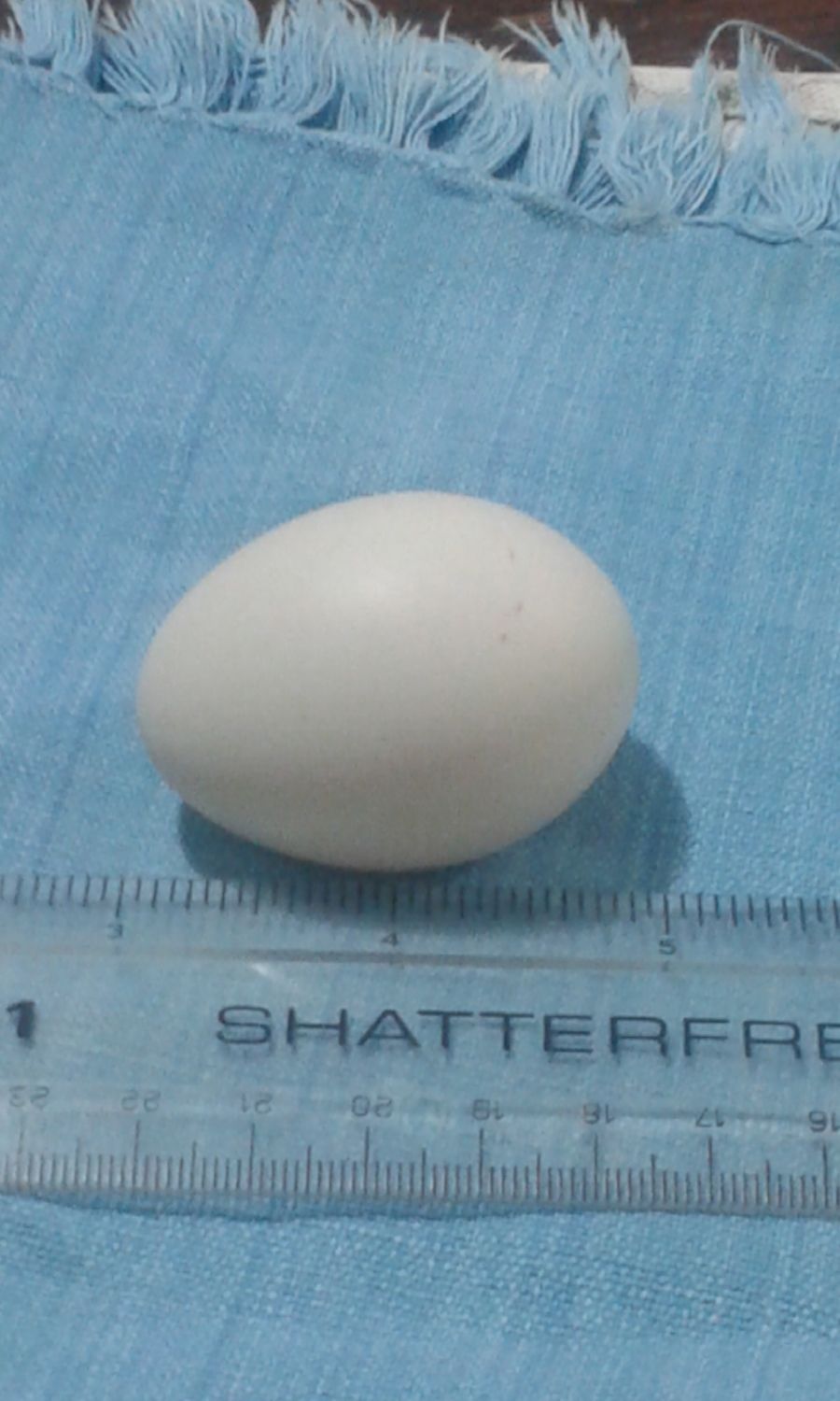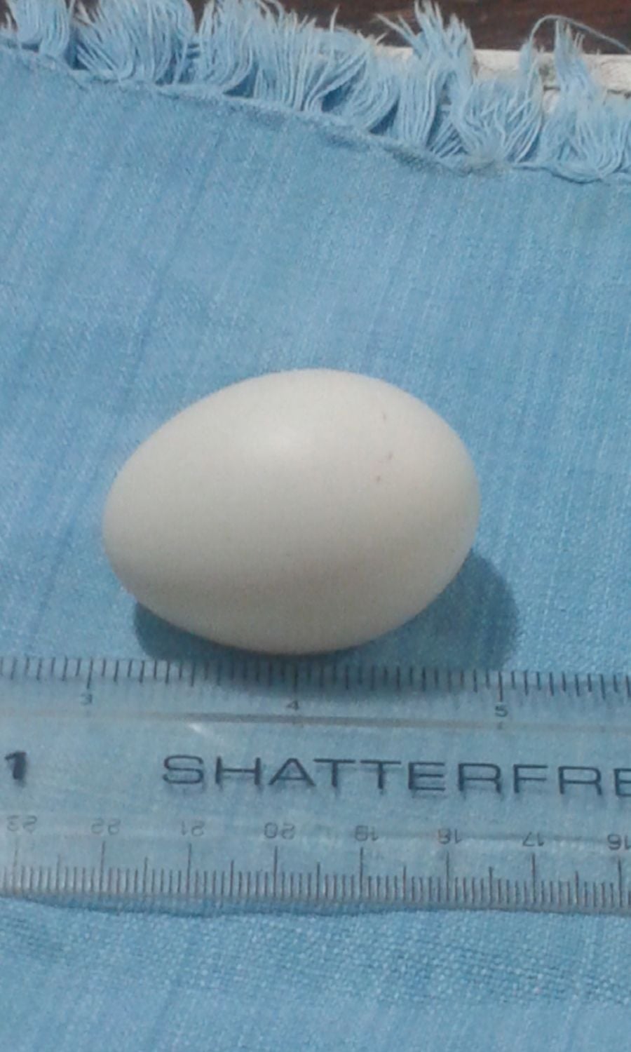 They are reasonably good layers, but my experience is limited to these chickens, so I have nothing to compare it to. I get about 3 - 4 eggs per chicken per week. The eggs are on the small size, typical for bantams I suppose. I use three of their eggs to equal two large store bought eggs. They are whiteish in colour. They are about 2" long and about 1-3/8" in diameter.