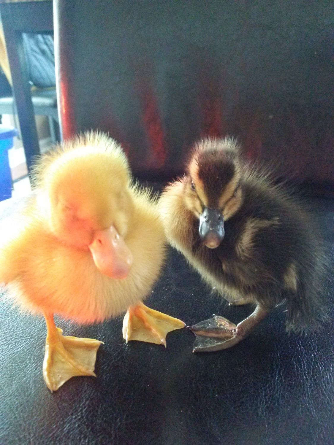 Looking at them, the darker one is a mallard derivative, probably a Rouen (If I spelled that wrong, sorry, I always seem to get the ue flubbed up) and the yellow perhaps a Pekin.