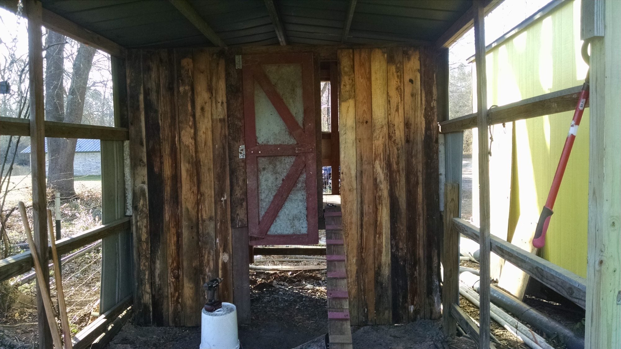 Coop during construction, The wall slats have been cut off at about the bottom of the door now.