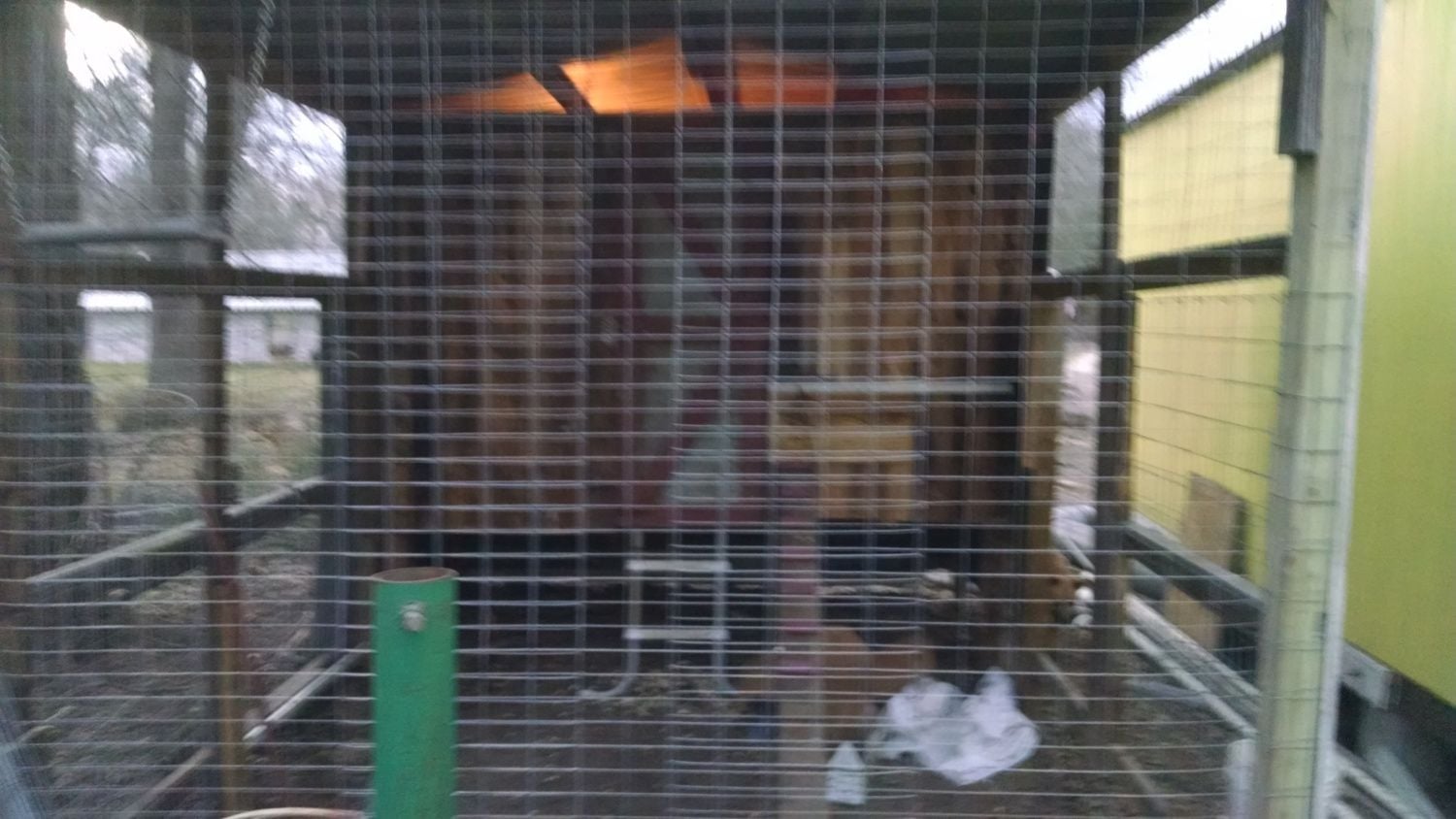 I am brooding them in the newly constructed coop, Photo below. The Coop is 9 foot by 5 foot inside and about 5'10" tall. It is three foot off the ground (trying to make it harder on the foxes I have seen) and is inside a 9 X 16 aviary. It is a converted pole barn that I used to park my old tractor under.
