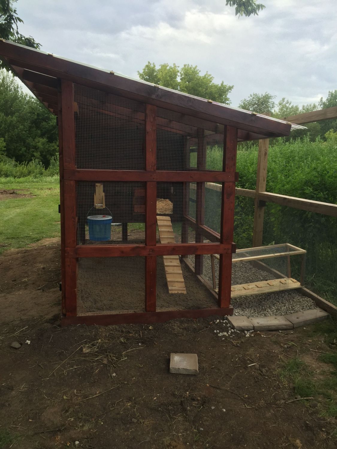When they were outgrowing the brooder, the coop we were building wasn't quite ready yet so we put them out in one of those mini kit things they sell at Fleet Farm. It served its short-term purpose while we finished the bigger coop we were building based on the Wichita Coop design we saw here on the Backyard Chickens site. They moved into that coop a few days ago. The chickens currently have access to a portion of my garden that got so overtaken by weeds this year that I wasn't able to get it back (there was some dormant weed in my own compost that I added to my garden this spring