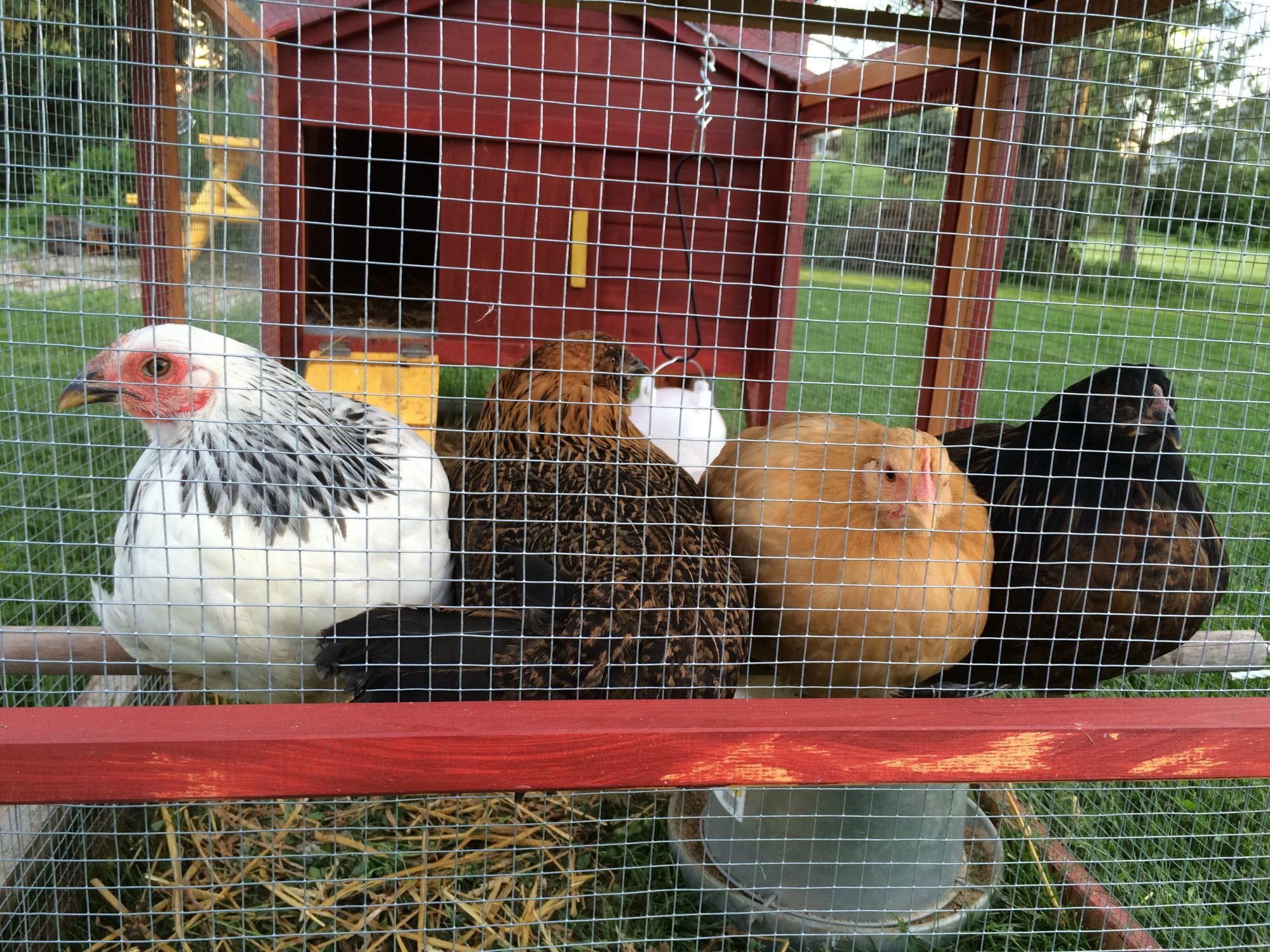 I have 4 chickens (the ordinance limit) in a tractor coop (ordered on Amazon). One Buff Orpington, one Light Brahma, and two Aracaunas. Got them as chicks at the local feed store around Easter, looking forward to first eggs sometime in August I am guessing.