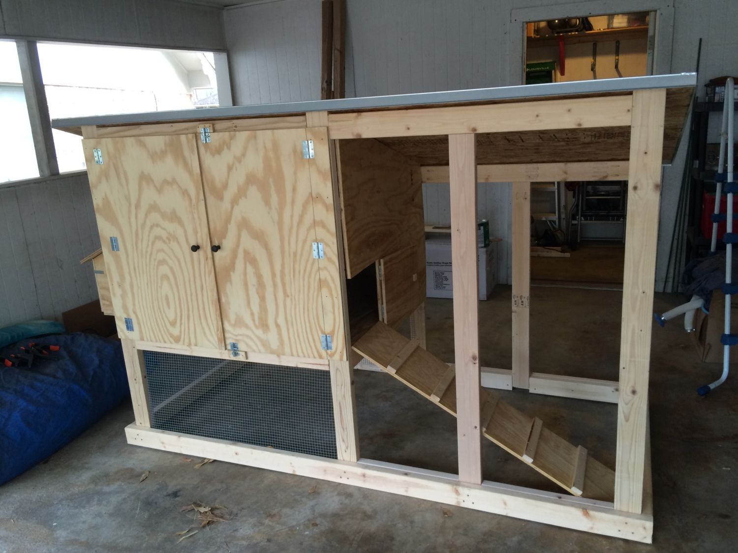 My name is Matt, and I live in Nacogdoches, Texas. My wife and I just got 4 little chicks (2 Rhode Island Reds and 2 Ameraucanas) that are only about 2 weeks old now. My wife had the idea of getting chickens last year, so my Christmas present for her this past Christmas was to build her a chicken coop. I based it mostly off of the design of the "Country Acres" plans that someone posted on this site. I changed several things from the original plans. Here is a photo I took of the progress back in February: