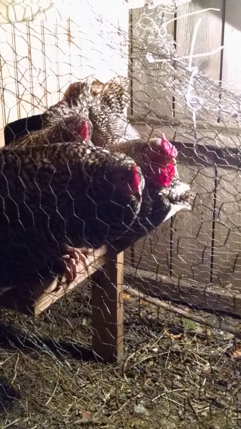 I asked for up to four hens. I was talked into taking a rooster and two hens--Dominiques.