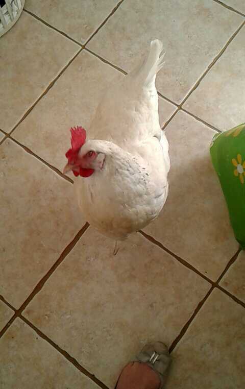 Yes only have the one, she's a white Sussex,a bit of a sorry story how she came to us, she was wandering around my husbands work place, he befriended her but other workers there were going to kill her, my daughter fell in love with her and named her doug, she has been with us for over a year now and comes in the house everyday, we have had an issue with foxes trying to get her but none have been successful