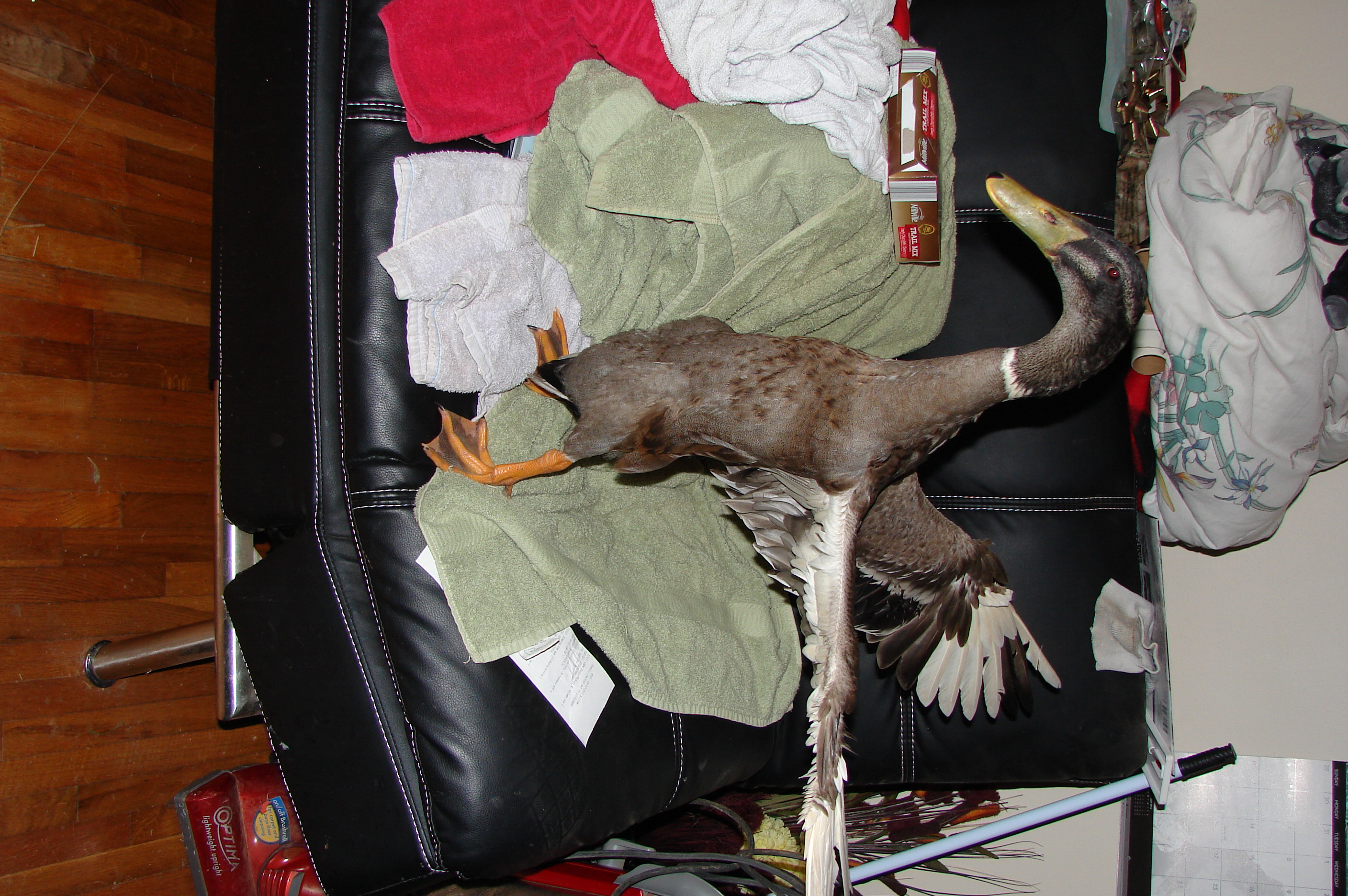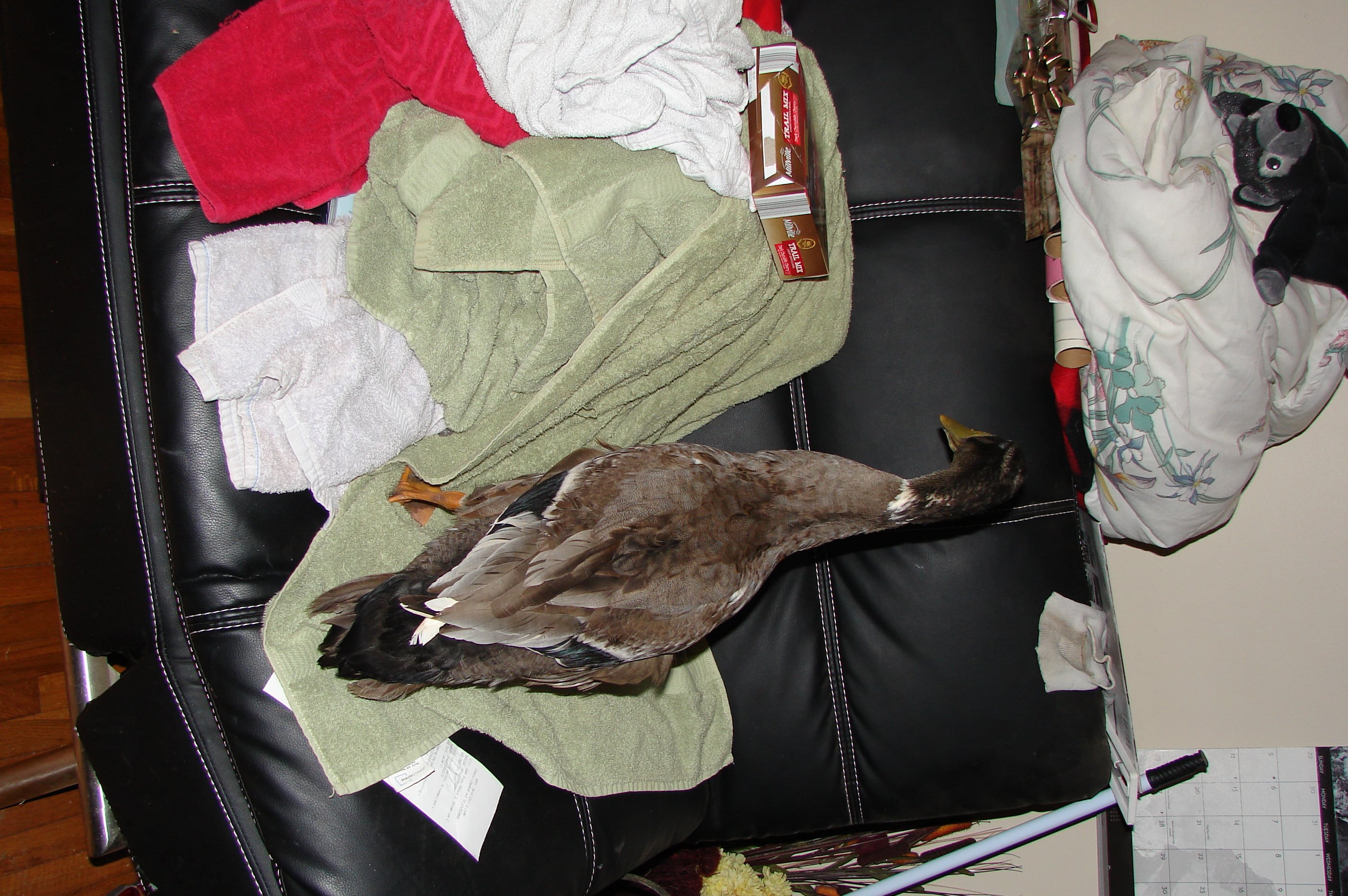 In the back view (sorry it's sideways - I can't figure out how to rotate them) he shows a bit of green in his wings - a partially obscured speculum. In the side view he shows the effects of his single runner gene: white wing tips and a white neck ring not due to being a Mallard (he was born with the white neck ring).