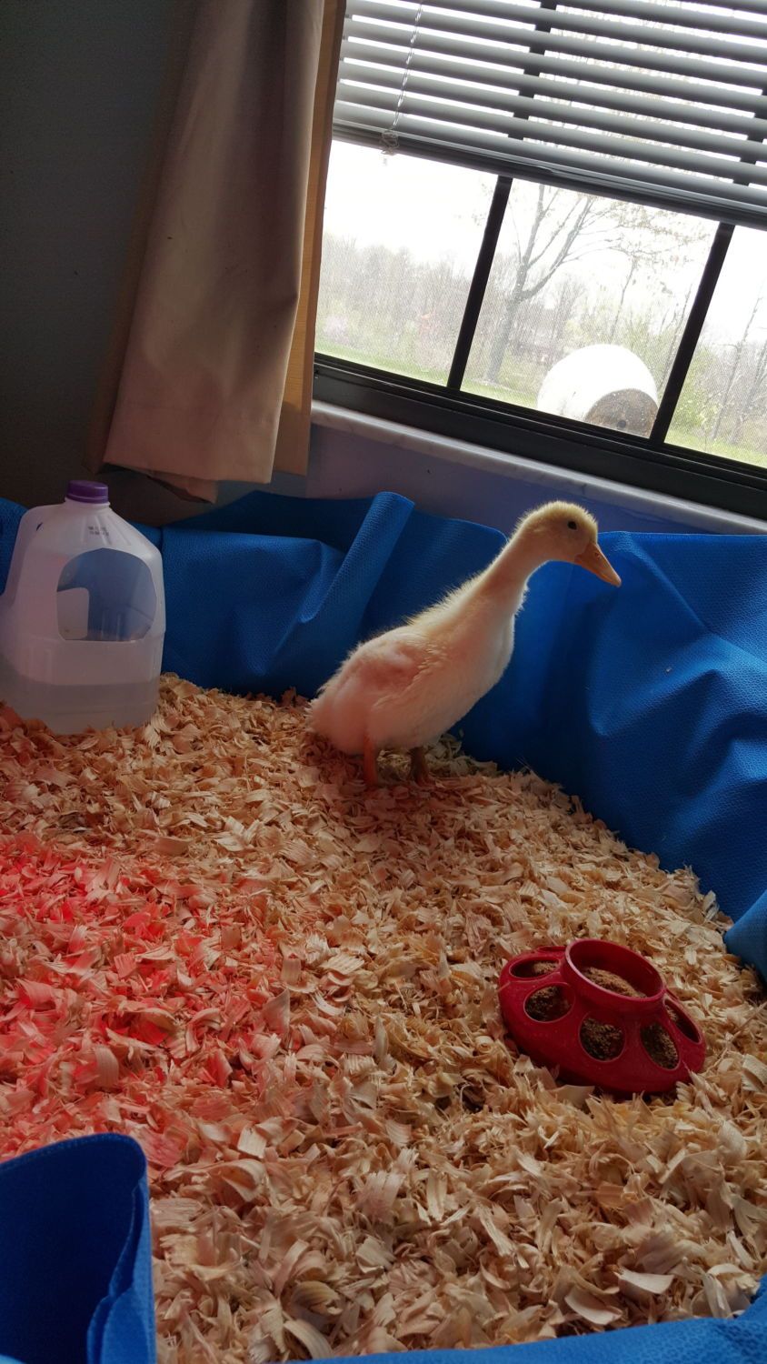 Long story short, my friend at the local shelter saw they got a duck in so I now have a free duck. I posted a pic on Facebook and the consensus was that she? is about 4 weeks old and could be a runner, pekin or a buff orphington. Any thoughts? I have a heat lamp in the corner but she does not use it much so I may give her a bathtub swim this afternoon.