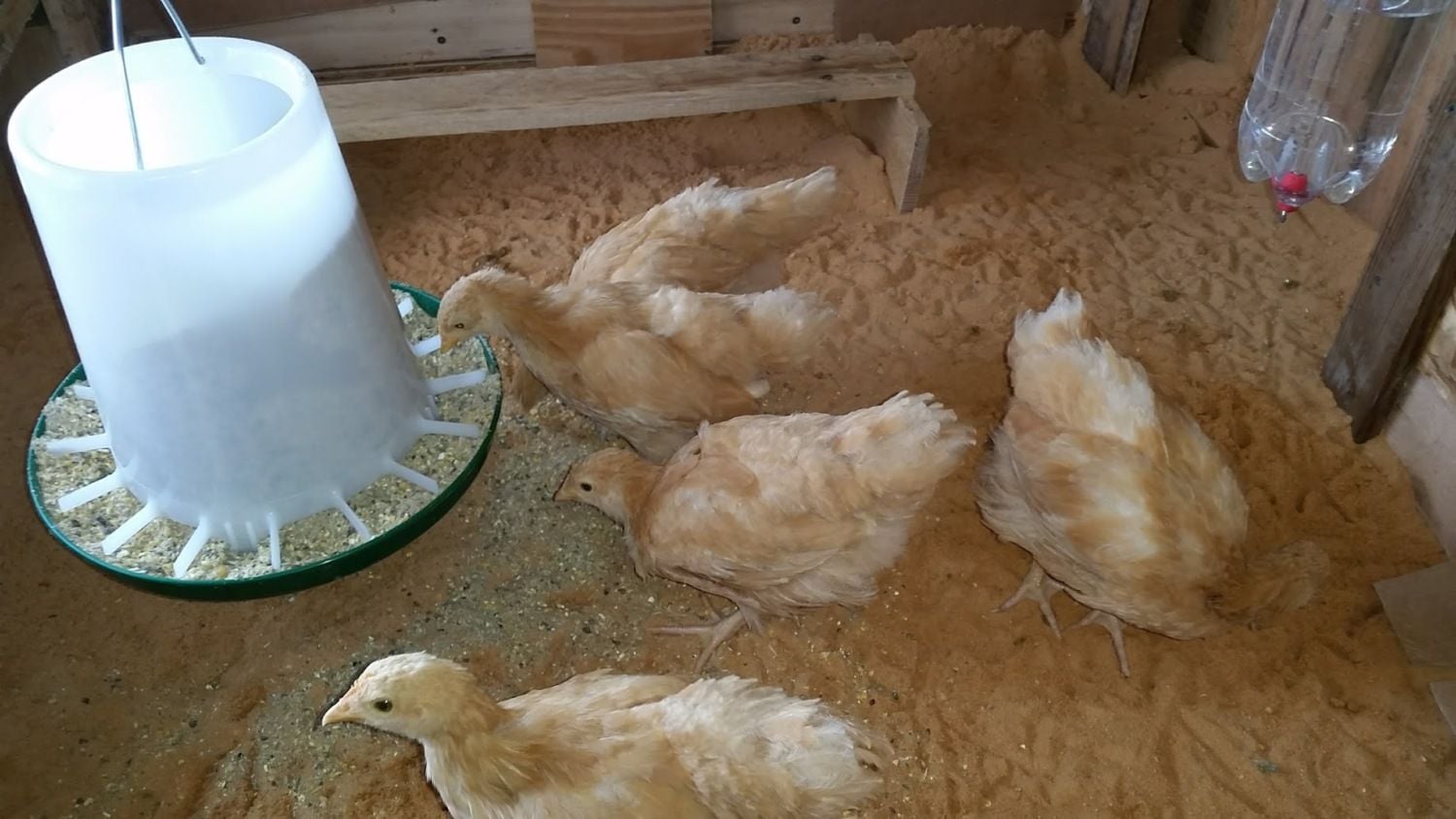 Finally finished. The hanging bucket will be lowered as a waterer. Right now they are confined to the coop but will be let out in a week or so when they will be 7 weeks old.