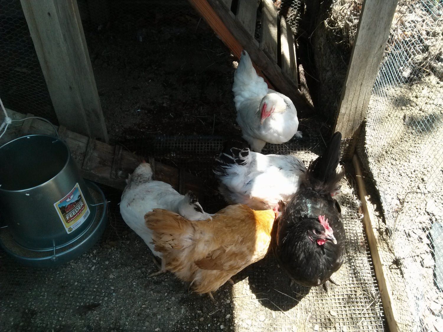 Refurbished our previous coop which started out as an Iguana enclosure. We put it outside and added outside space. Had to go without chickens for a few years and always missed them. Friends have been complaining they have to throw their snails and dandelion weeds away! This year we replaced the roof and all wire to smaller gauge as we had a few mice make their way in through the old wire. We just picked up 2 Black Austrolorps, 2 Delaware, a Buff Plymouth Rock and a Wyandotte. I doubt they had the snacks they got this morning before; strawberry tops. I expect a day or two of 'stress' before they go back to laying. They are a year old and a bit 'picked' on as it looked like they were crowded where I got them. The grandkids are due for their summer visit and will be thrilled. Chickens and 2 new kittens to replace 2 ancient kitties we lost last year.