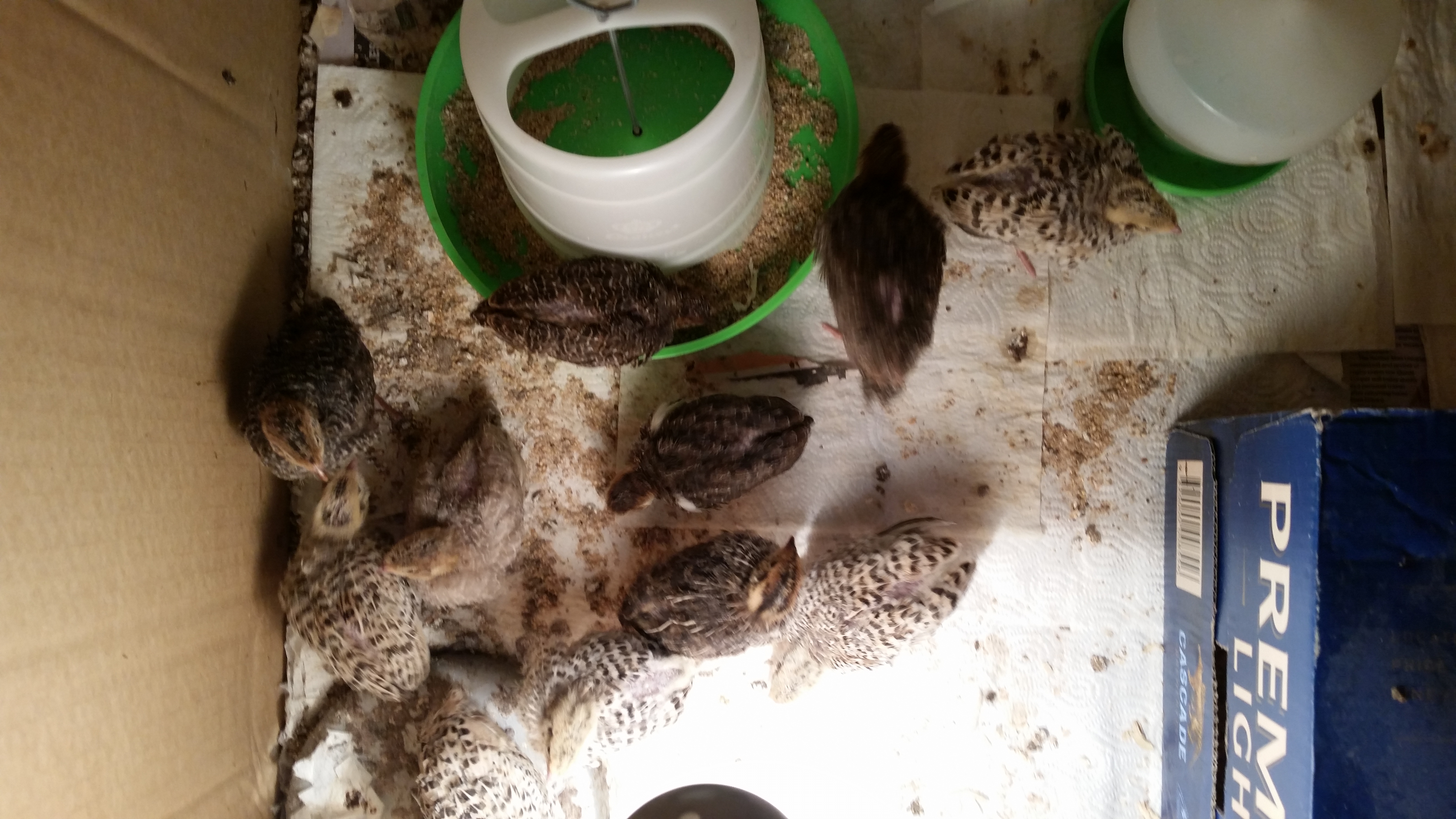 The quail are in a box about 3 foot square. I still have a heat source in there and they seem happy to either sleep near it or away as the mood takes them. About a week ago I put in a smaller box on it's side which I fill with wood shavings (from the rural supply store) for them to scratch/sleep in for less heat/light.