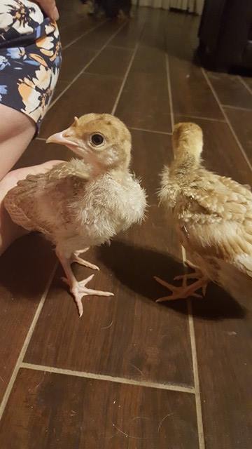 So these are my two poults that I was worried were starving themselves. They are eating more now, especially when they dump their food bowl over. But here's a question. They are supposedly Red Bourbons. But one of them has significant barring in its feathers compared to the other. I honestly don't care if it isn't a Bourbon, I'd just like to clarify whether it is or is not and whether it would dictate hen vs. tom in that particular breed? Or do I perhaps have another breed that got mixed in with the reds? Either way I love them to bits, although the barred one likes to get out of their pen. He/she is a houdini.
