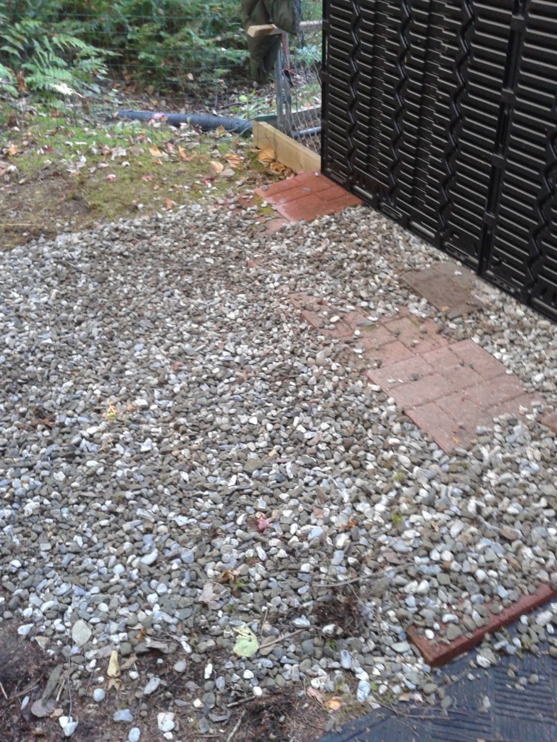 Then, we realized that the base that came with the shed was not ridged, so we scrambled to create a level pad by stacking paving stones and using gravel from our driveway.