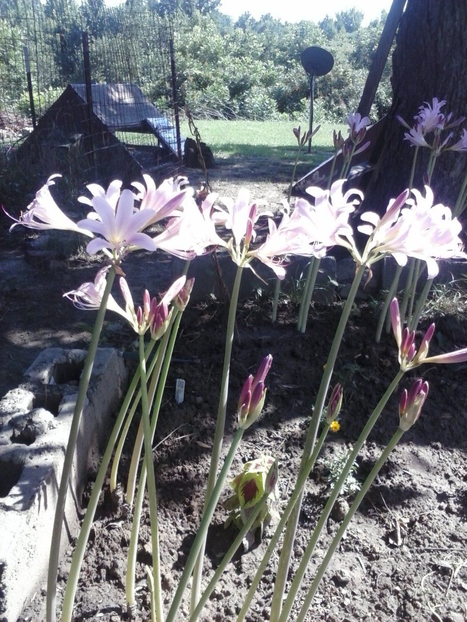 6+ Naked Ladies ? not sure on the name. They begin as green foilage then that dies off and the stalk starts to grow and pink flowers top it off.