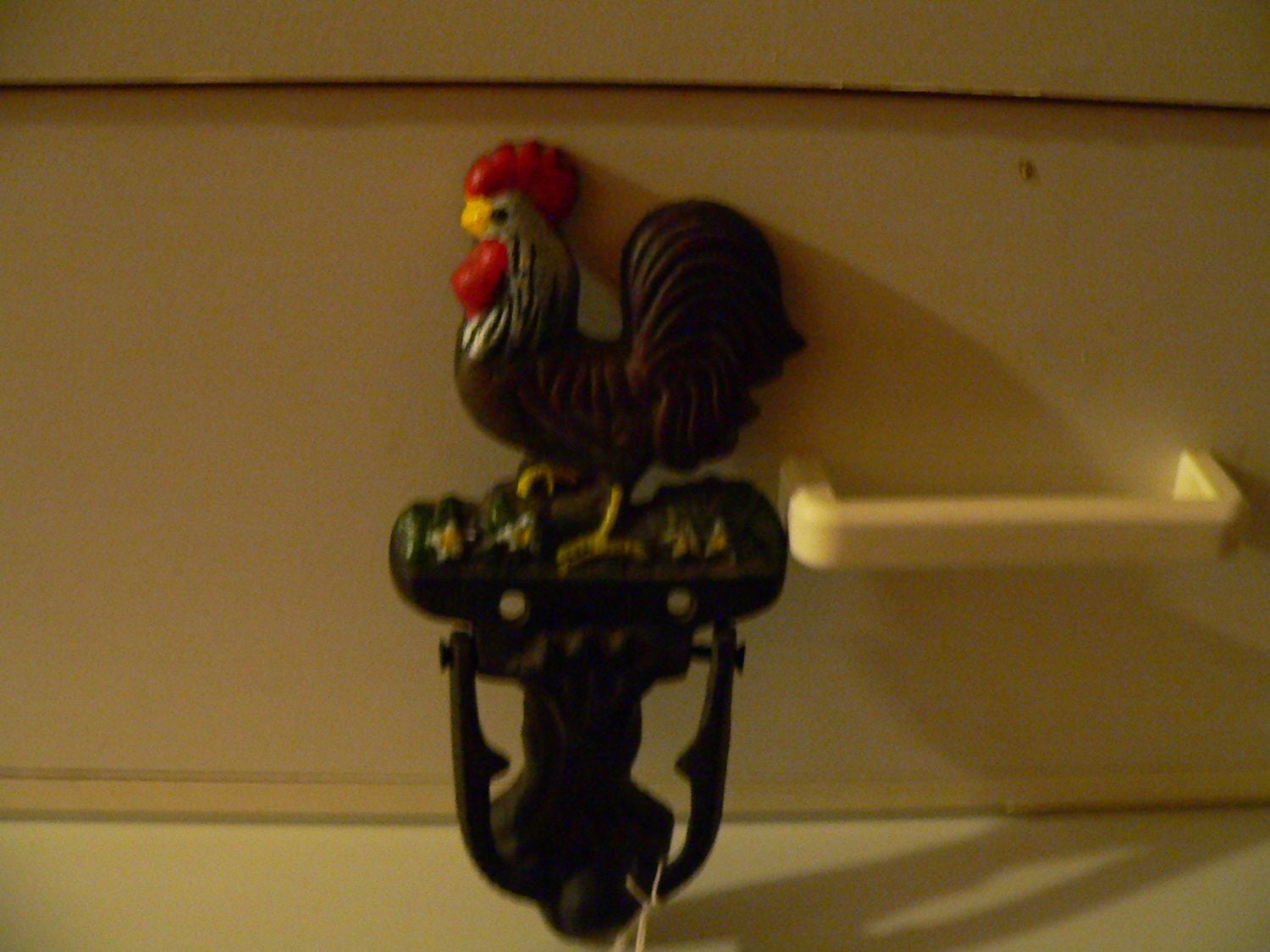 Just got home... give me a few to find some neat stuff.... Okay just thought of something, I have a Black rod iron door knocker with a rooster on it. Its painted, but If i were you, I would repaint it to look like your favorite rooster. Real nice, once I get back in from taking care of the chickens I'll take a picture. Go head and pop another bag :pop while you wait