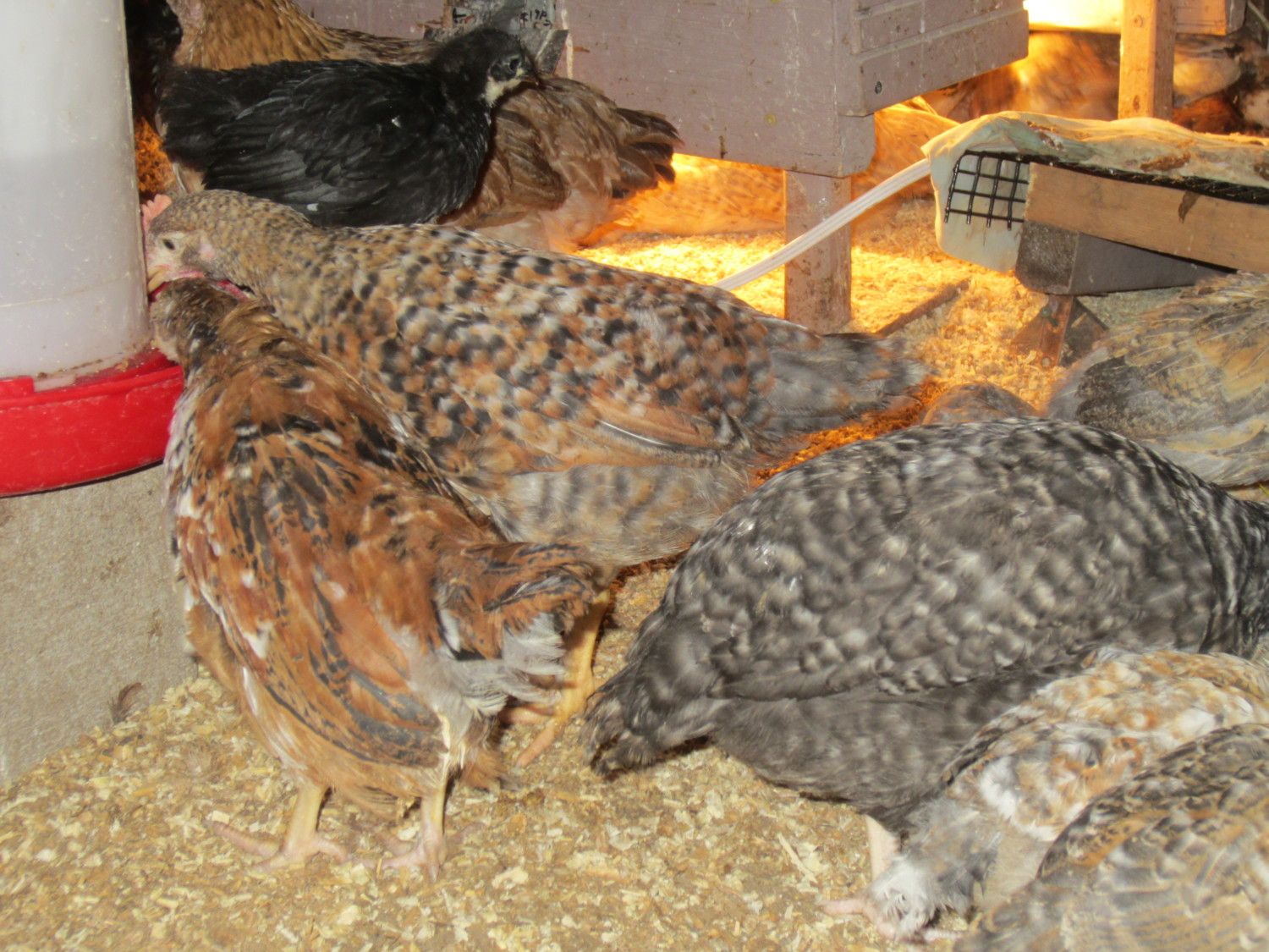 The two drinking water are roosters - the red/black/speckled one is a Swedish Flower Hen mix