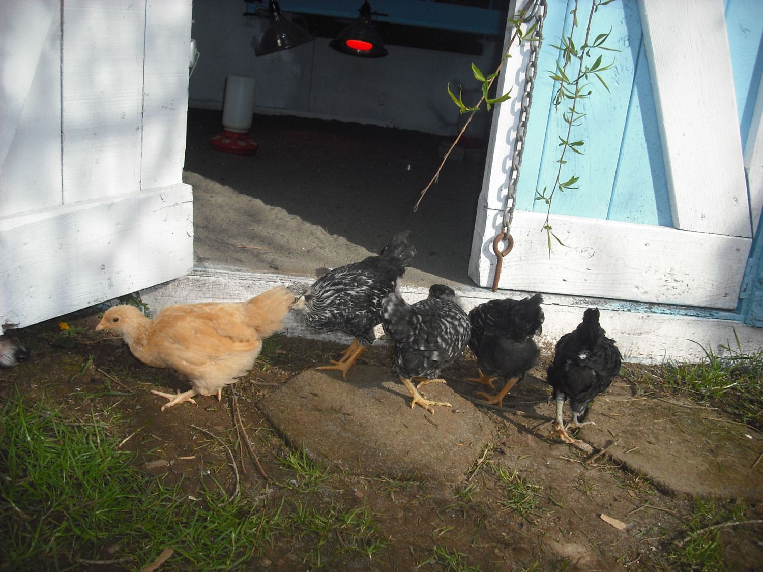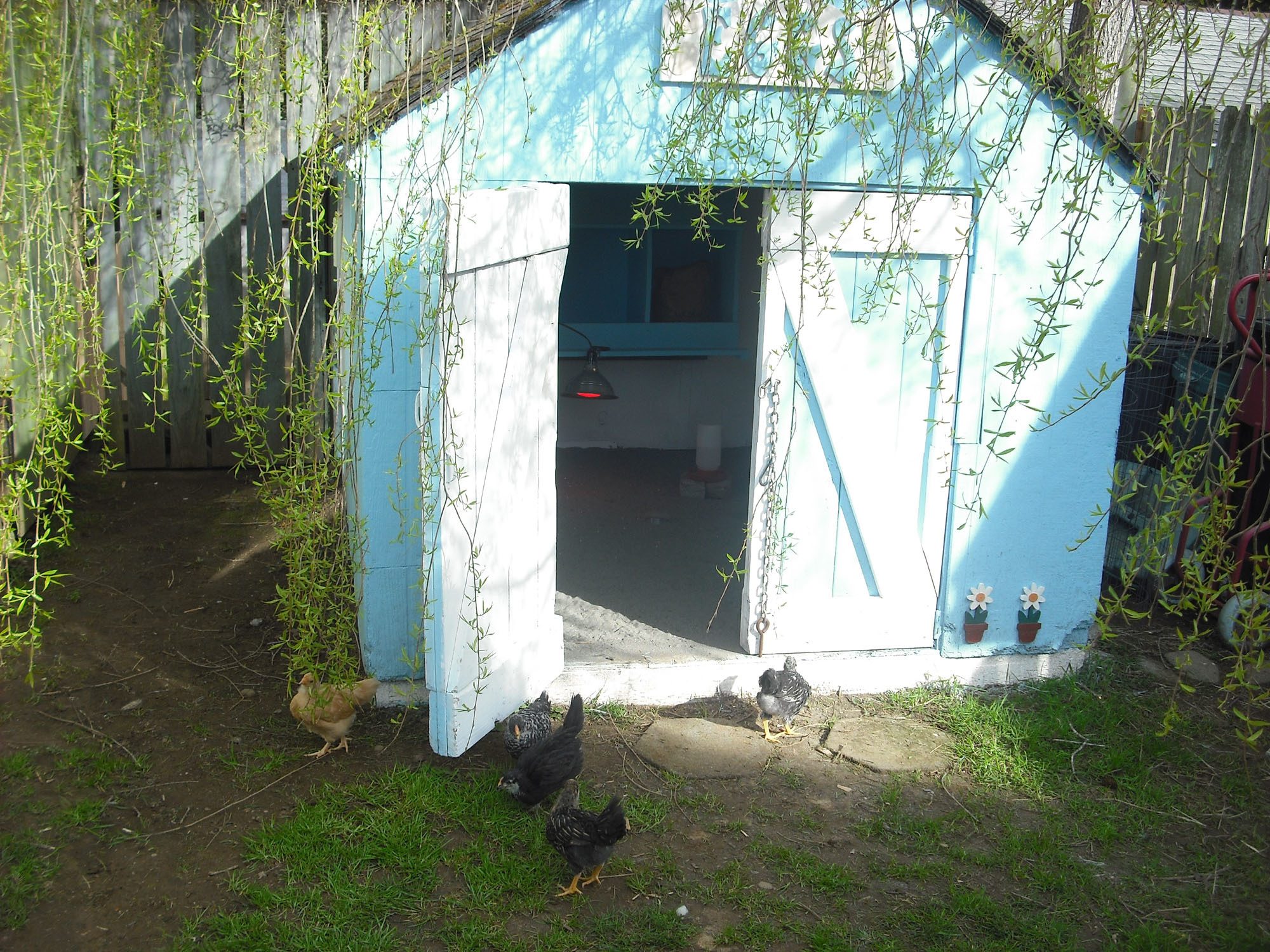 Here's a picture of them and their coop (which was an old playhouse from when I was young).