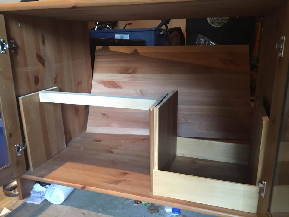 the interior of the cabinet is 23.5" high by 22.5" deep by 35" wide. I will replace the Ikea cardboard back panel with one of the two former interior shelves, with a window and a door cut into the back to provide access to the run. (there will also be a 1" gap at the top that I will enclose in wire for more ventilation. The whole thing will get a layer of exterior paint and I'm looking into some simple slanted roof options, maybe corregated metal.