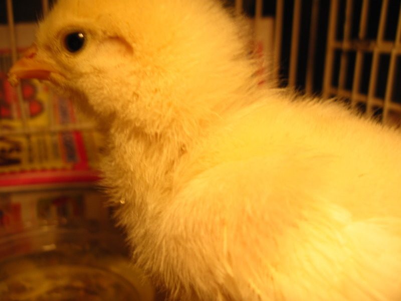 Today we stopped in TSC and I noticed a little red pullet that had a bulging eye. They boxed her up and gave her to us. Freeda, the free chick is now in a small brooder and apparently has a deformed skull and scalp.